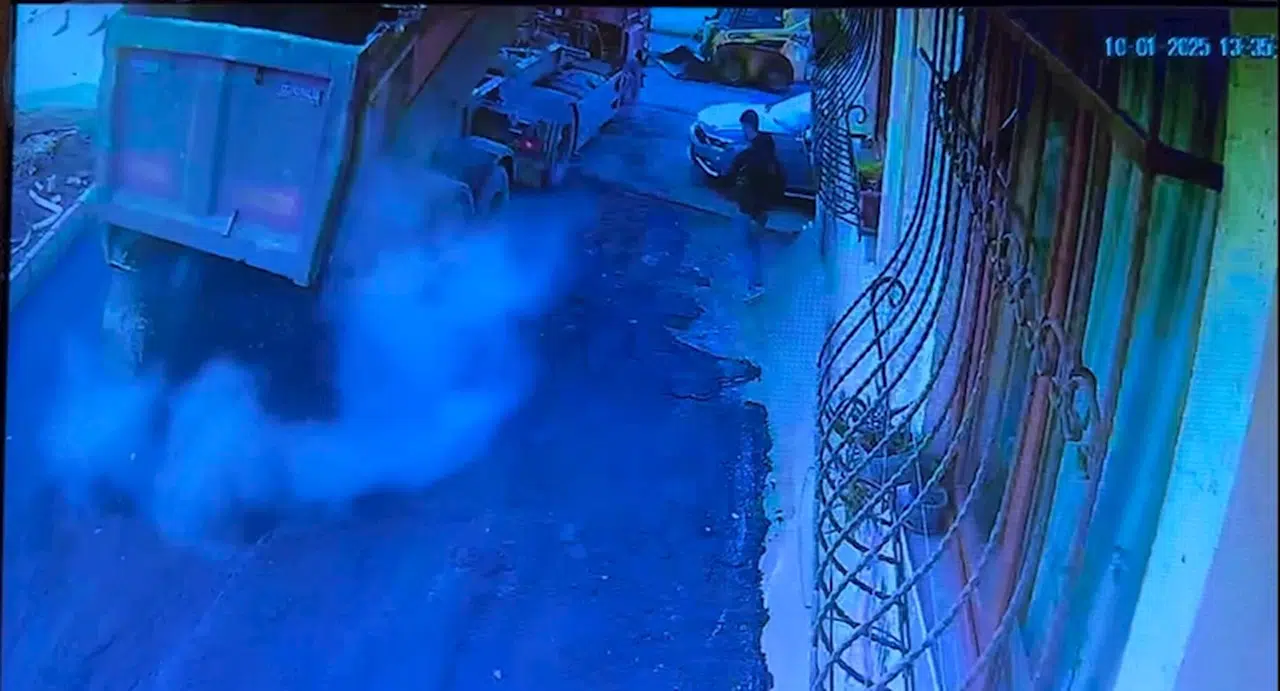 Doğan Can CESUR / İSTANBUL (DHA) - KAĞITHANE’de yola asfalt döken hafriyat kamyonunun damperi devrilerek yan tarafta bulunan binanın balkonuna girdi. Binadakilerin korku yaşadığı o anlar güvenlik kamerasına yansırken, kamyonun yanından geçerek binanın yan tarafına yürüyen bir kişi iseölümden saniyelerle kurtuldu. Dairenin balkonunda maddi hasar meydana gelirken, ev sahibi Birgül Çiğdem, "Beni aradılar, evine kamyon girdi dediler. Öyle çok kötü birşeydi" dedi.