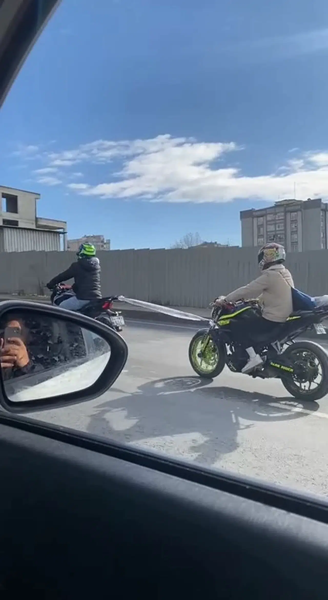 Olay, dün saat 12.40 sıralarında Atakent Mahallesi O-3 Güney Yanyolda meydana geldi. Yolda seyir halinde olan motosiklet arızalandı. Arızalanan motosiklet sürücüsüne başka bir sürücü yardım etti. Arızalanan motosiklet plastik poşet bağlanarak çekildi. Öndeki motosiklet sürücüsü arızalanan motosikletle arasına plastik poşet bağlayarak trafikte uzun süre bu şekilde ilerledi. O anlar cep telefonu kamerası tarafından görüntülendi. (DHA)