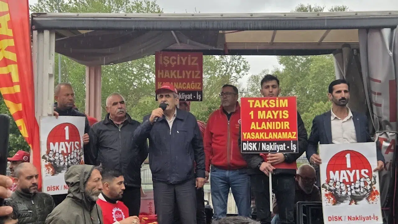 İSTANBUL (DHA) – DEVRİMCİ İşçi Sendikaları Konfederasyonu’na (DİSK) bağlı Nakliyat-İş Sendikası üyeleri, 1 Mayıs Emek ve Dayanışma Günü dolayısıyla Saraçhane’de bir araya geldi. Grup, burada basın açıklaması yaptı.
