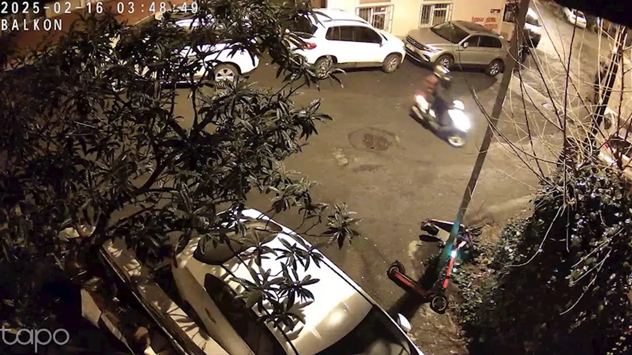 Öte yandan hırsızlık anları güvenlik kamerasına yansıdı. Görüntülerde, motosikletli 2 hırsızdan birisi aşağı iniyor. Daha sonra park halindeki motosikleti önce sürüklüyor ardından da yokuş aşağı ittikten sonra binip çalıyor.
