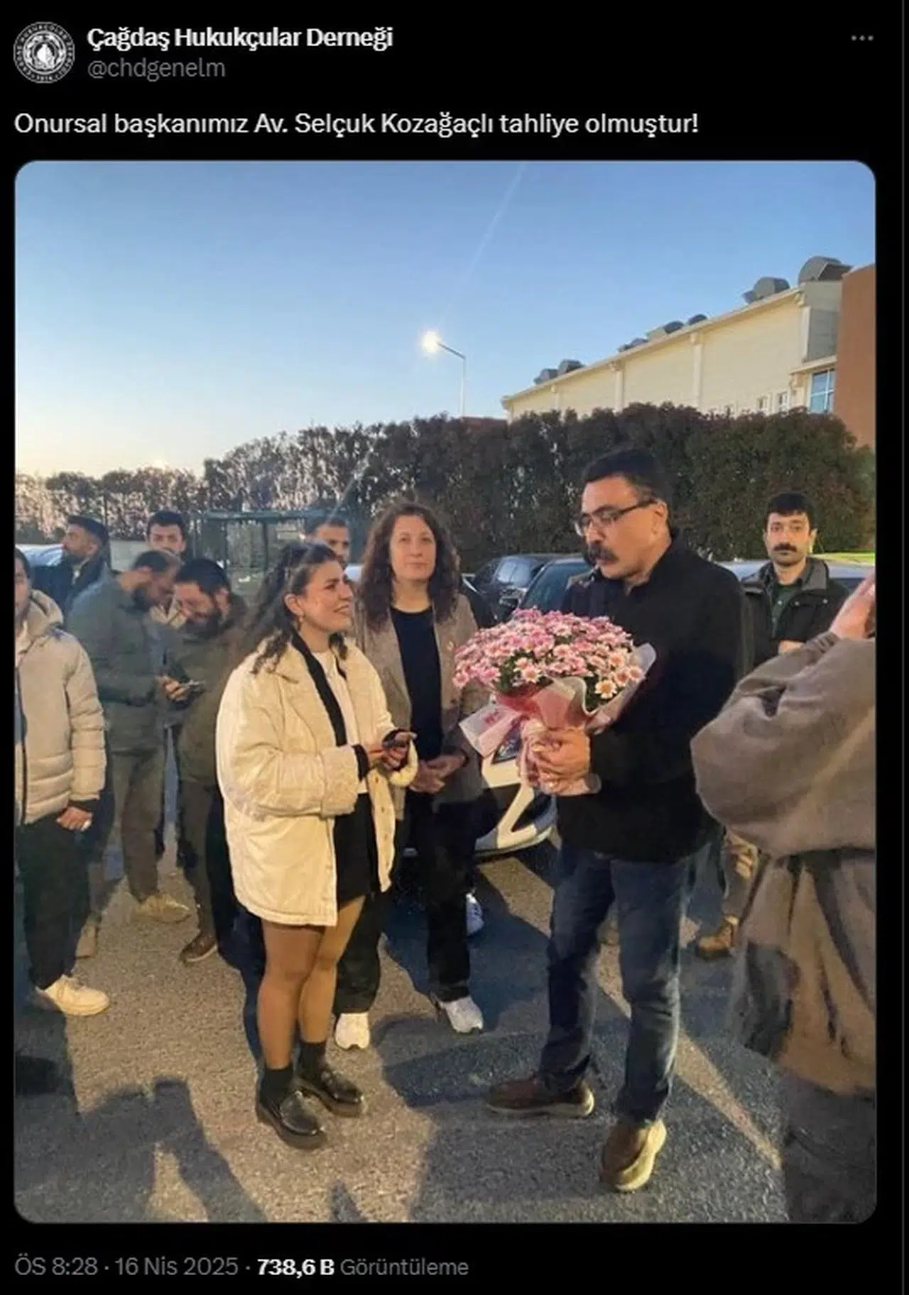 Gülseren KARAPINAR/İSTANBUL,(DHA) - ÇAĞDAŞ Hukukçular Derneği’nin(ÇHD) Onursal Genel Başkanı Selçuk Kozağaçlı, tutuklu olduğu Marmara Ceza İnfaz Kurumu'ndan 8 yıl sonra tahliye edildi. Kozağaçlı'nın tahliyesi, ÇHD'nin sosyal medya hesabından duyuruldu.