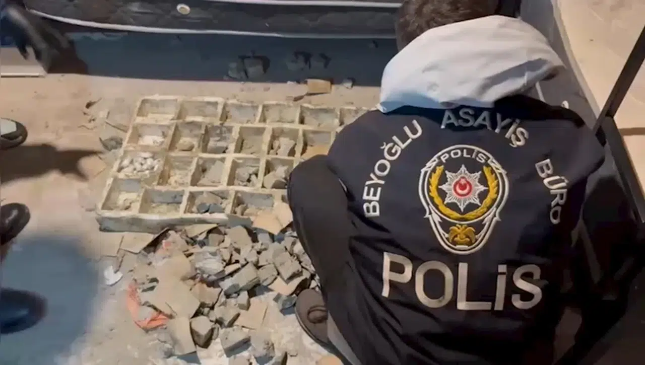 Bunun üzerine adrese giden Beyoğlu Asayiş Büro Amirliği ekipleri, dolapların içerisindeki poşetlerde 695 gram esrar, 775 gram kokain, 2 adet hassas terazi, 1 adet şarjör, 34 adet mermi, çok sayıda uyuşturucu koymakta kullanılan kilitli poşet ve streç film ele geçirdi. Aramalar sırasında polisin dikkatini evde bulunan beton kalıpları çekti. Çekiç yardımıyla kalıpları tek tek kıran polis, içerisine gizlenmiş toplamda 288 adet ekstazi hap ele geçirdi.
