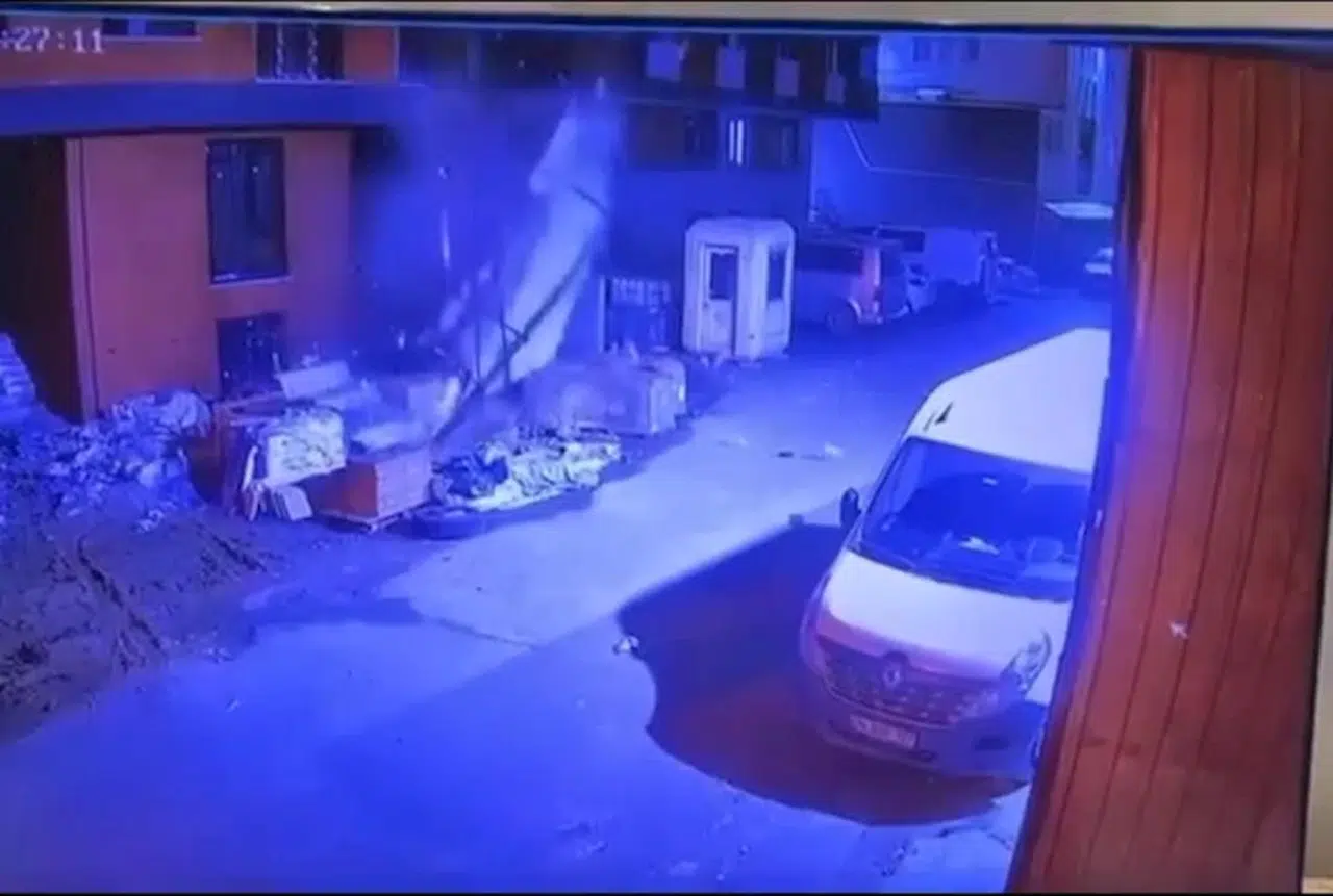 Güvenlik kamerasına yansıyan görüntülerde inşaat halinde bulunan binanın dış cephesinin uçtuğu görülüyor.
