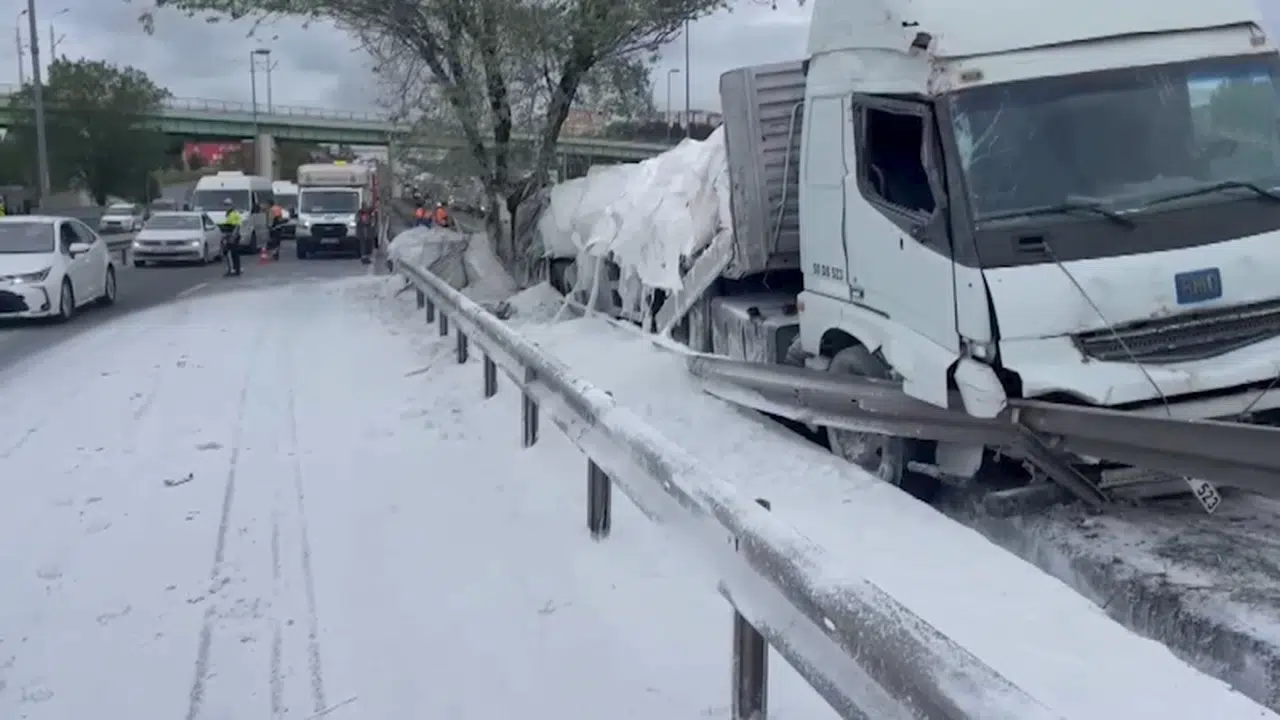 Özgür EREN/İSTANBUL, (DHA)- ZEYTİNBURNU, D-100 Karayolu'nda toz alçı yüklü TIR, bariyerlere çarptı. Kazanın ardından TIR'daki alçılar yola saçılırken, D-100'de trafik oluştu.