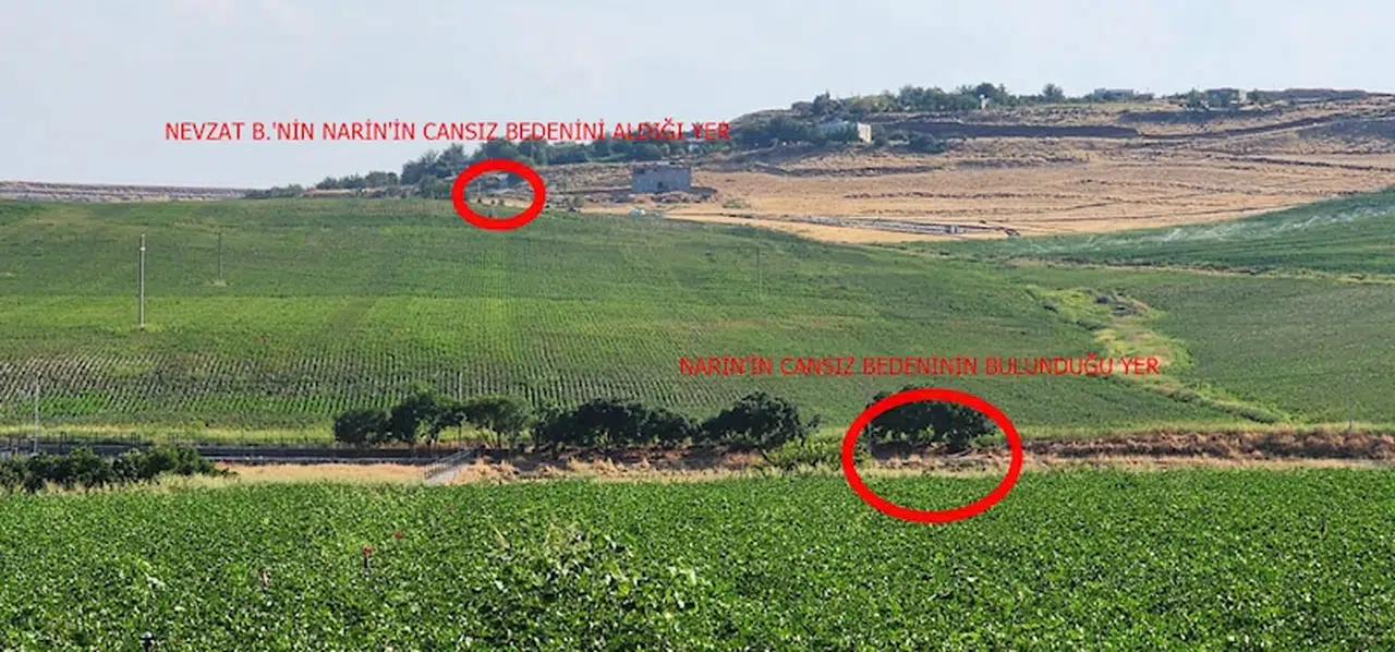 Kırsal Tavşantepe Mahallesi'nde 21 Ağustos'ta kaybolan, en son aynı gün 15.15’te okulun güvenlik kamerasına yansıyan Narin Güran, aramaların 19'uncu gününde Eğertutmaz Deresi'nde, çuval içerisinde ve üzeri taşla örtülü şekilde ölü bulundu. Narin'in cansız bedeninin bulunmasından sonra jandarma ekipleri, olay yerinde çalışma başlattı. Bu kapsamda kırmızı bir otomobilin, 21 Ağustos'ta saat 15.40'ta Narin'in cesedinin bulunduğu dereye yakın bölgeye gelip, park ettiği ve yaklaşık 50 dakika boyunca orada kaldığı belirlendi. Jandarmanın çalışmasıyla kırmızı aracın, sıva ustası Nevzat B.'ye ait olduğu saptandı. Bunun üzerine Nevzat B., gözaltına alındı
