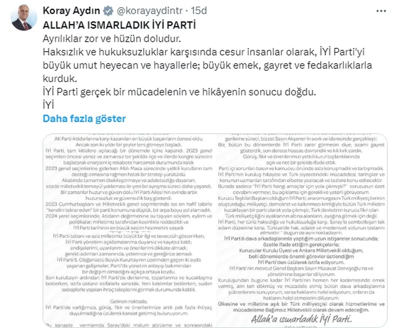 Koray Aydın, sosyal medya hesabından yaptığı açıklamada, parti içerisinde işlerin son 2 yıldır ters gittiğini belirtti. 6'lı masa ve 31 Mayıs 2024 Mahalli İdareler Genel Seçimleri süreçlerine ilişkin eleştirilerde bulunan Aydın, partideki tüm erime ve gerileme sürecinin önceki Genel Başkan Meral Akşener'in sevk ve idaresinde gerçekleştiğini aktardı.