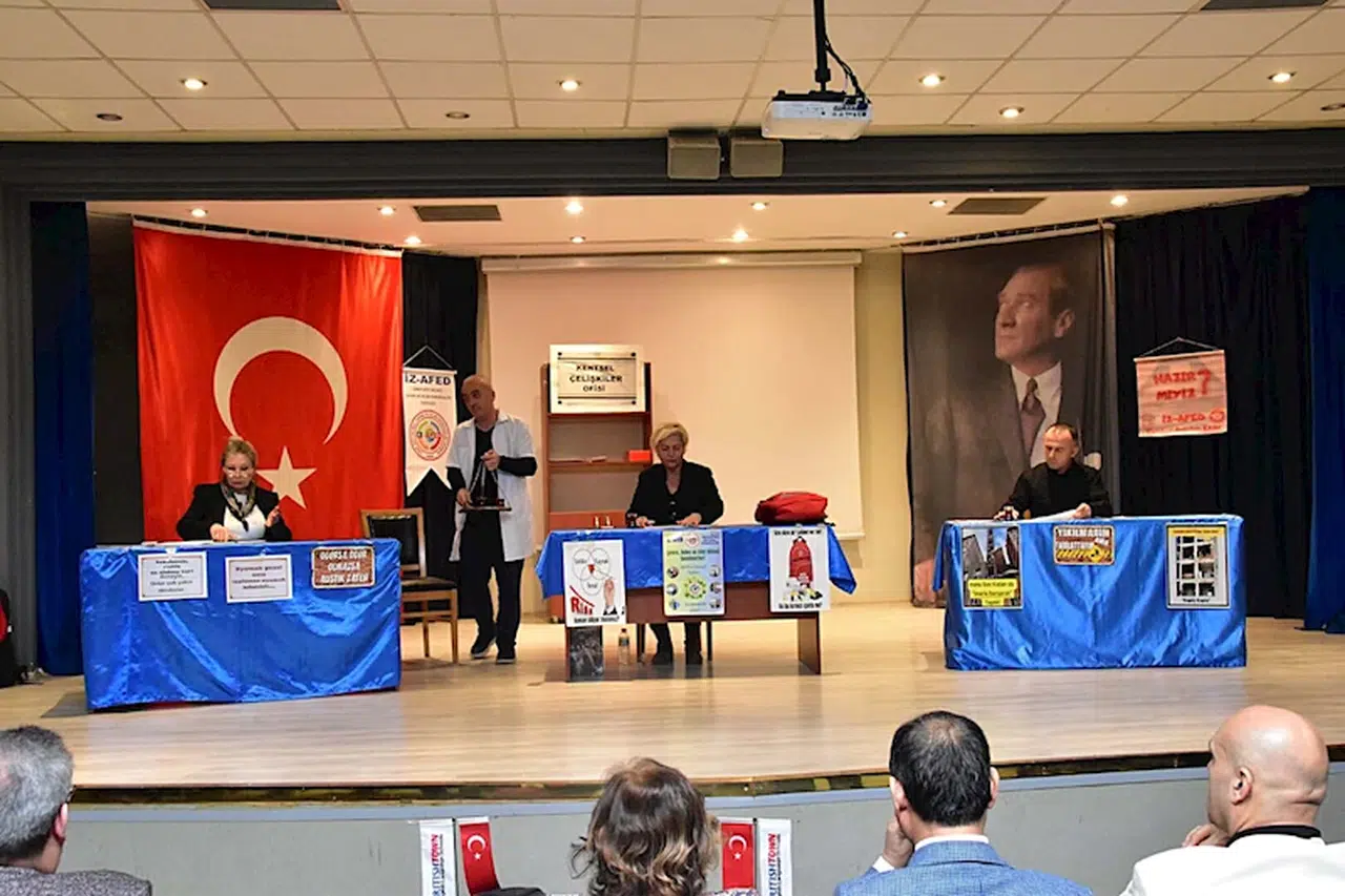 İZ-AFED üyeleri, afetler olmadan önce alınması gereken önlemleri, bu kez Dokuz Eylül Üniversitesi (DEÜ) İktisadi ve İdari Bilimler Fakültesi Dr. Ömer Yiğitbaşı Konferans Salonu'nda sahneledikleri gösteriyle anlattı. Yaklaşık 15 dakika süren 'Kentsel Çelişkiler Ofisi' adlı oyunda afetlerle ilgili kavramlar hatırlatılarak doğru bilinen yanlışlara dikkat çekildi. Afet yönetimi alanında farklı kurumlarda yaklaşık 20 yıl görev yapıp, İl Afet ve Acil Durum Müdürlüğü'nden emekli olan İZ-AFED'in kurucusu Servet Ertaş, bu oyunu 3'üncü kez sahnelediklerini belirtti. 17 Ağustos depreminin yıl dönümünde Kültürpark Gençlik Tiyatrosu'nda, 30 Ekim depreminin yıl dönümünde Türkan Saylan Kültür Merkezi'nde sahneledikleri oyunu 3'üncü kez izleyiciyle buluşturduklarını söyleyen Ertaş, "Yıllardır afet eğitimleri veriyorum. AFAD'dan emekli afet bilinci eğitmeniyim. Klasik salon eğitimleri ve seminerlerin bir süre sonra insanları sıkmaya başladığını fark ettik. Teknik bilgiler fazla ilgi çekmiyor. Yöntemi değiştirmeye karar verdik. Bunları komedi ve mizah kullanarak tiyatroda anlatalım, dedik" ifadelerini kullandı. Yaklaşık 15 dakikalık kısa oyunu kendisinin kaleme aldığını anlatan Ertaş, "Amacımız toplumda afetle ilgili doğru sanılan yanlışlara mizahi açıdan yaklaşmak. Kulaktan dolma sözler vardır. Deprem olduğunda eşik altında durmak, pencereden balkondan atlamak doğru sanılır. Biz bu yanlışlara dikkat çekmek istedik. Afetlerle ilgili kavramların her birine dokunduk. Eğitim vermiyoruz. Böyle bir amacımız yok. Konuları, kavramları dile getirip farkındalık oluşturuyoruz" diye konuştu.