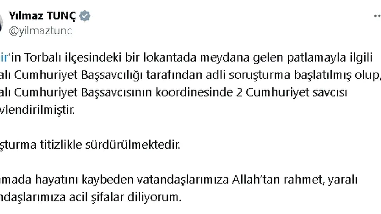 Adalet Bakanı Yılmaz Tunç, sosyal medya hesabından yaptığı açıklamada, "İzmir’in Torbalı ilçesindeki bir lokantada meydana gelen patlamayla ilgili Torbalı Cumhuriyet Başsavcılığı tarafından adli soruşturma başlatılmış olup, Torbalı Cumhuriyet Başsavcısının koordinesinde 2 Cumhuriyet savcısı görevlendirilmiştir. Soruşturma titizlikle sürdürülmektedir. Patlamada hayatını kaybeden vatandaşlarımıza Allah’tan rahmet, yaralı vatandaşlarımıza acil şifalar diliyorum" ifadelerini kullandı.