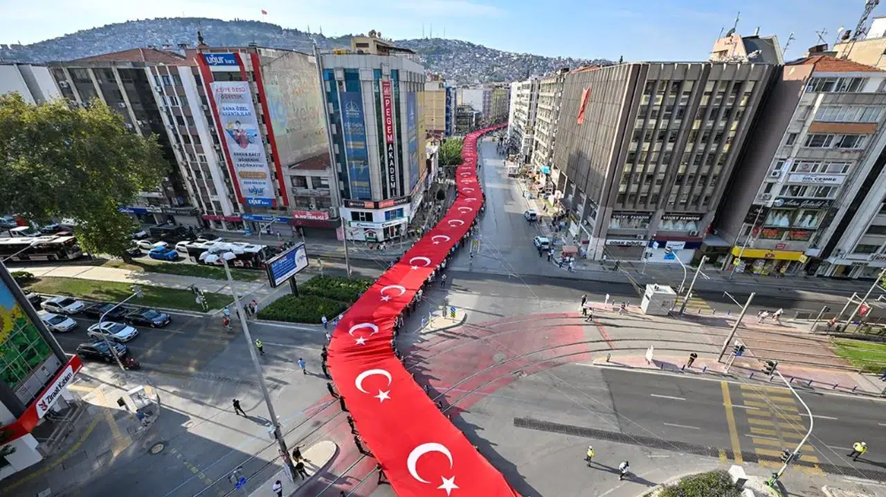 Gaziler, Anafartalar ile İkiçeşmelik caddelerinin ardından Cumhuriyet Meydanı'nda son bulan yürüyüşte İzmirliler, 350 metre uzunluğundaki dev Türk bayrağını birlikte taşıdı.