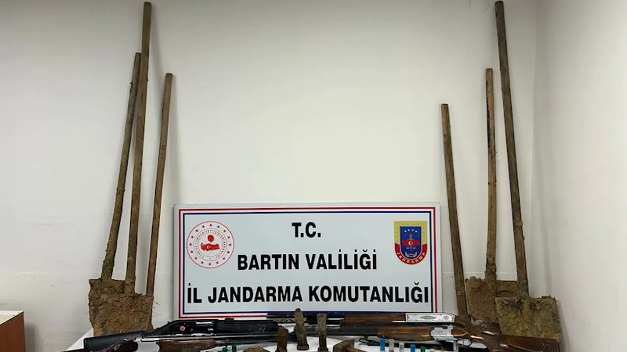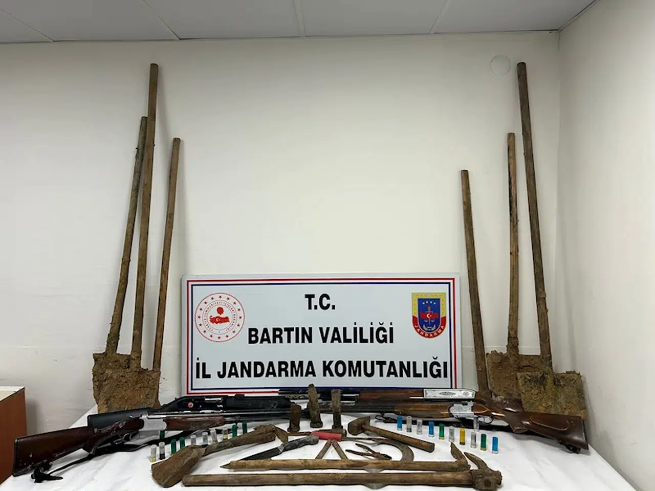 Bartın İl Jandarma Komutanlığı ekipleri, ilçeye bağlı Kaleköy köyünde define bulmak için 5 kişinin kaçak kazı yaptığı ihbarı üzerine harekete geçti. Jandarma ekipleri tarafından bir süre takip edilen şüpheliler, kaçak define kazısı yaptıkları sırada suçüstü yakalandı. Şüpheliler N.K (46), H.K (41), Ş.C (33) E.D (28) ve M.D (48) gözaltına alındı. 4 adet av tüfeği ve fişekler ile kazı malzemeleri ele geçirildi. Şüphelilerin ilçe jandarma komutanlığındaki işlemleri sürüyor. Olayla ilgili soruşturma başlatıldı. (DHA)