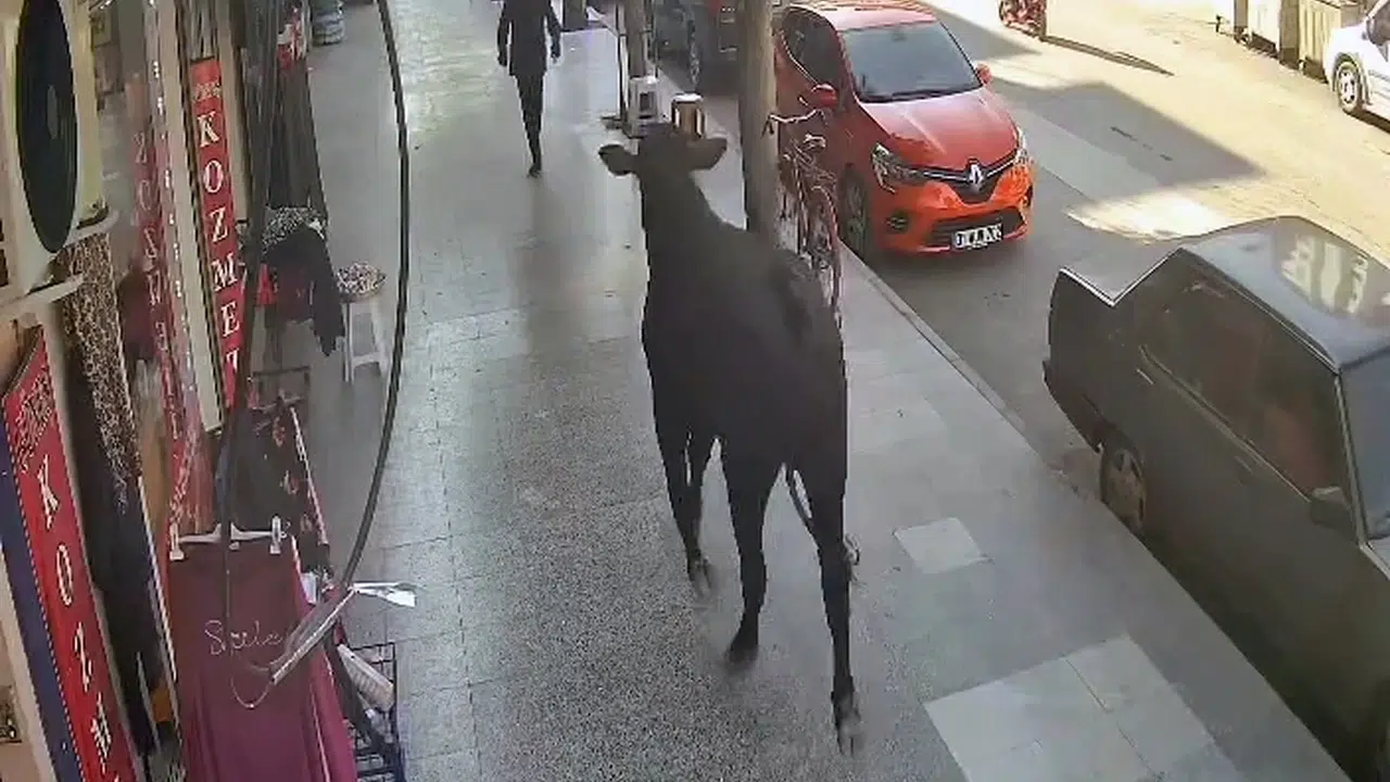 İlçe merkezini birbirine katan angusun, kaldırımda yürüyen kişiyi boynuz darbesiyle yaraladığı anlar ise bir iş yerinin güvenlik kamerasına yansıdı. (DHA)