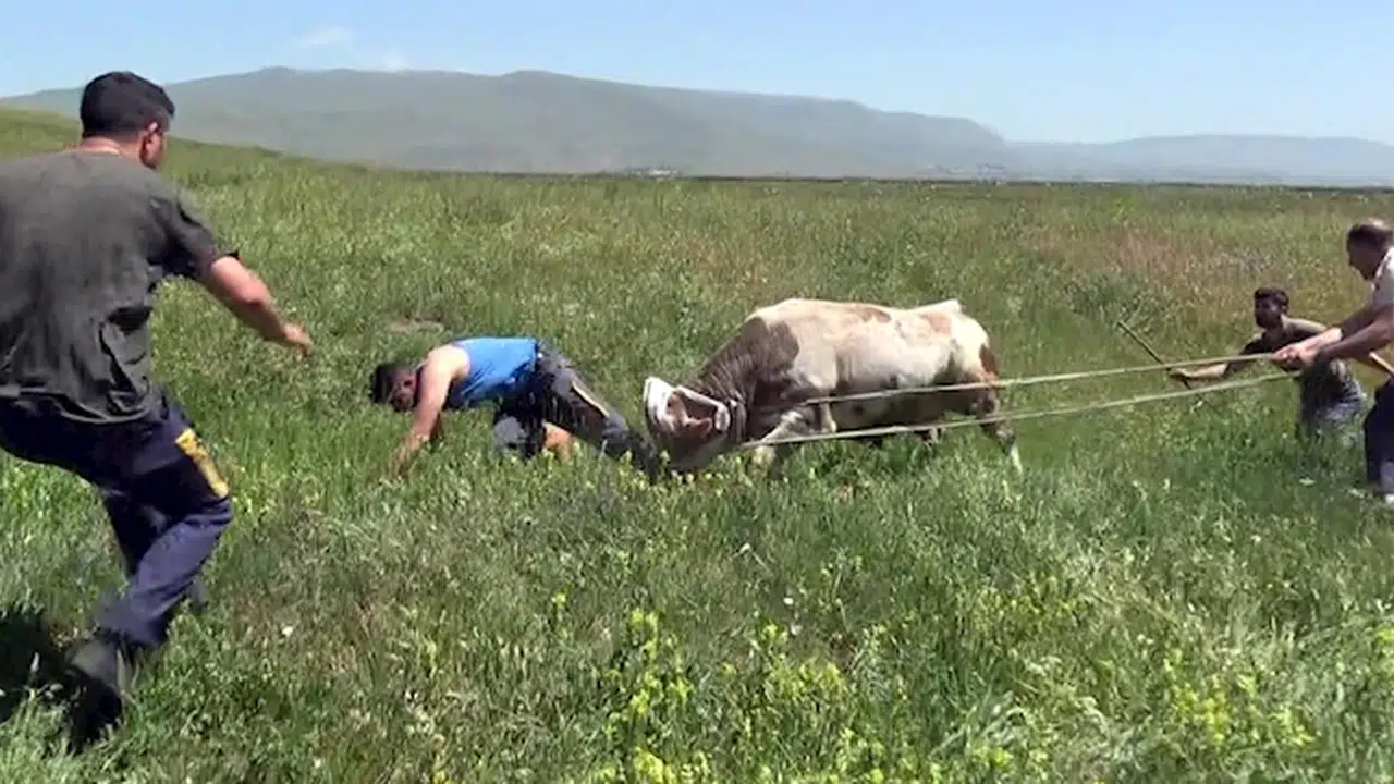 Kaçan boğaya uyuşturucu iğne atıp kementle yakaladılar, sahibi boynuz darbelerinden son anda kurtuldu