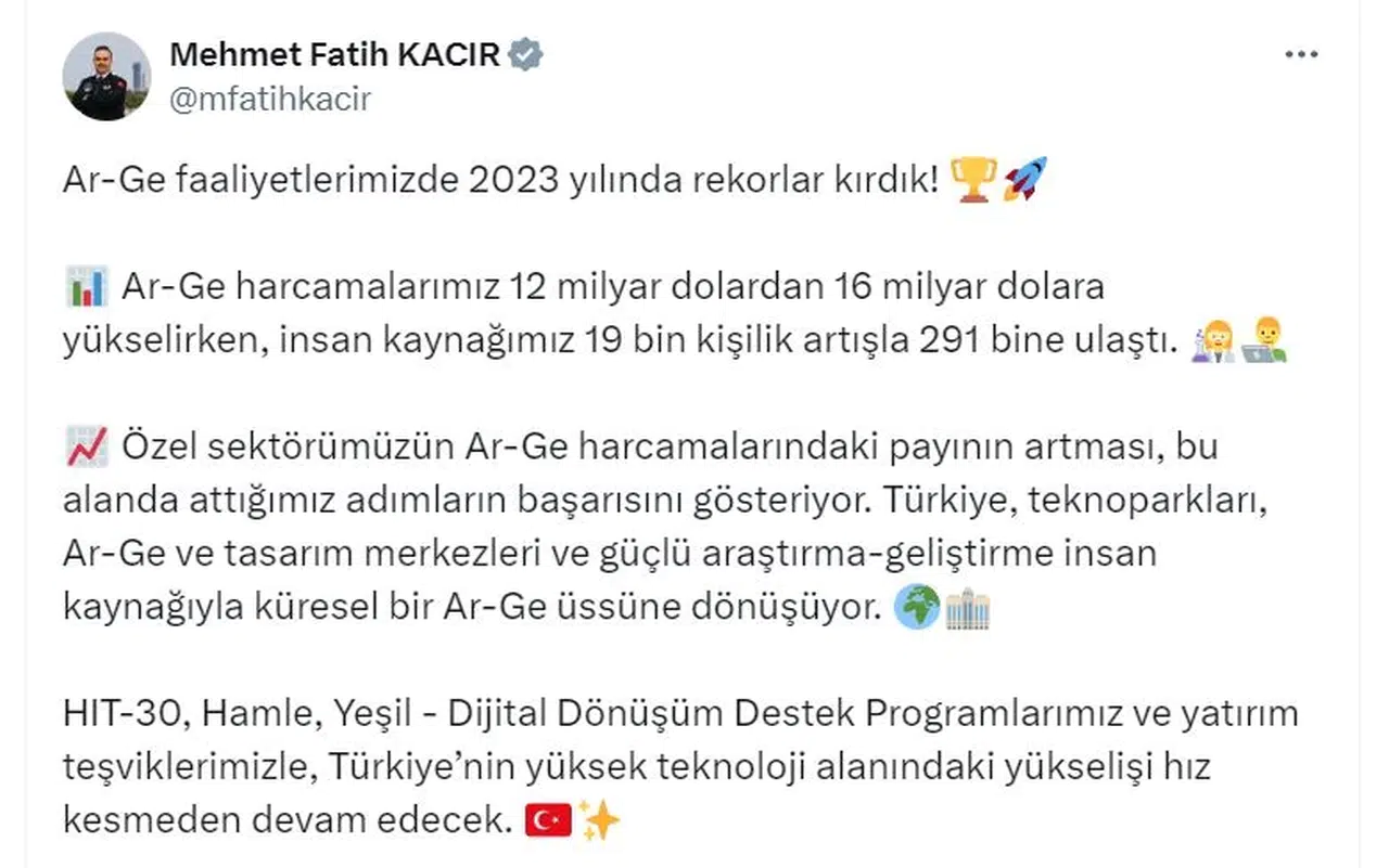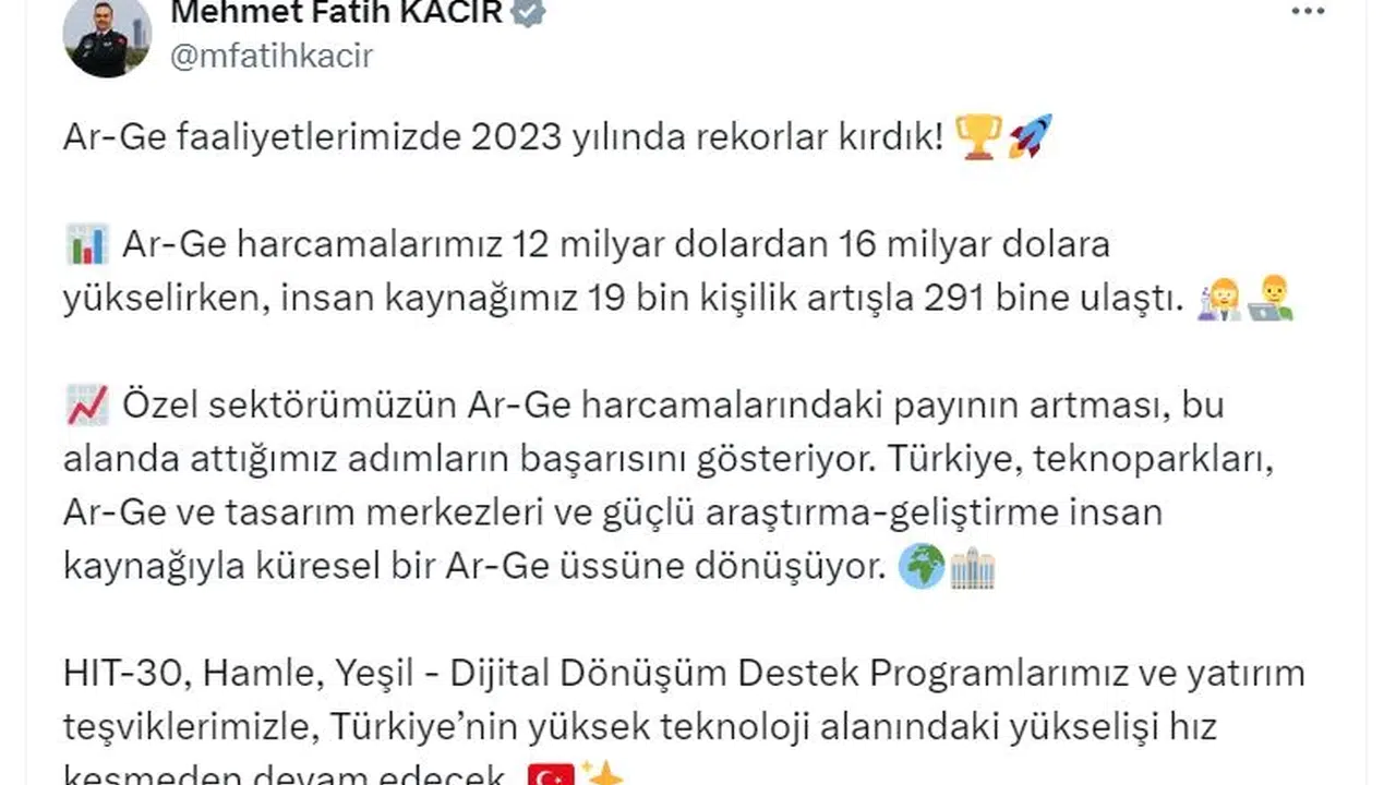 Bakan Kacır, sosyal medya hesabından yaptığı açıklamada, "Ar-Ge faaliyetlerimizde 2023 yılında rekorlar kırdık. Ar-Ge harcamalarımız 12 milyar dolardan 16 milyar dolara yükselirken, insan kaynağımız 19 bin kişilik artışla 291 bine ulaştı. Özel sektörümüzün Ar-Ge harcamalarındaki payının artması, bu alanda attığımız adımların başarısını gösteriyor. Türkiye, teknoparkları, Ar-Ge ve tasarım merkezleri ve güçlü araştırma-geliştirme insan kaynağıyla küresel bir Ar-Ge üssüne dönüşüyor. HIT-30, Hamle, Yeşil-Dijital Dönüşüm Destek Programlarımız ve yatırım teşviklerimizle, Türkiye'nin yüksek teknoloji alanındaki yükselişi hız kesmeden devam edecek" dedi. (DHA)