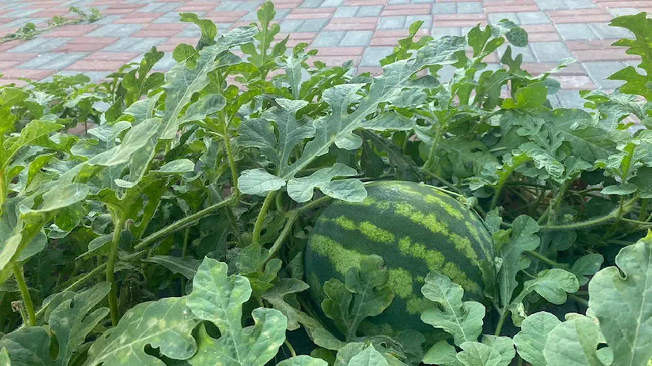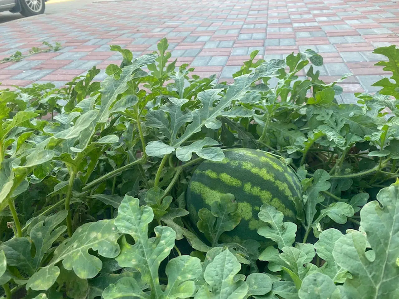 Hasan OLUM/NALLIHAN (Ankara), (DHA)- ANKARA'nın Nallıhan ilçesinde apartmanların önünde bulunan kaldırım taşlarının arasından kendiliğinden karpuz yetişti.