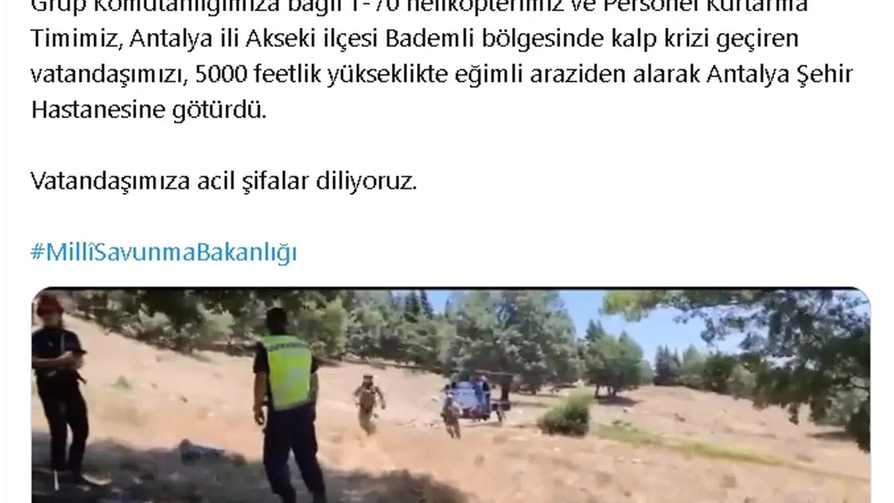 Bakanlıktan yapılan açıklamada, "Hava Kuvvetleri Komutanlığı Personel Kurtarma ve İleri Hava Kontrolörü Grup Komutanlığımıza bağlı T-70 helikopterimiz ve Personel Kurtarma Timimiz, Antalya ili Akseki ilçesi Bademli bölgesinde kalp krizi geçiren vatandaşımızı, 5000 feetlik yükseklikte eğimli araziden alarak Antalya Şehir Hastanesine götürdü. Vatandaşımıza acil şifalar diliyoruz" denildi. (DHA)