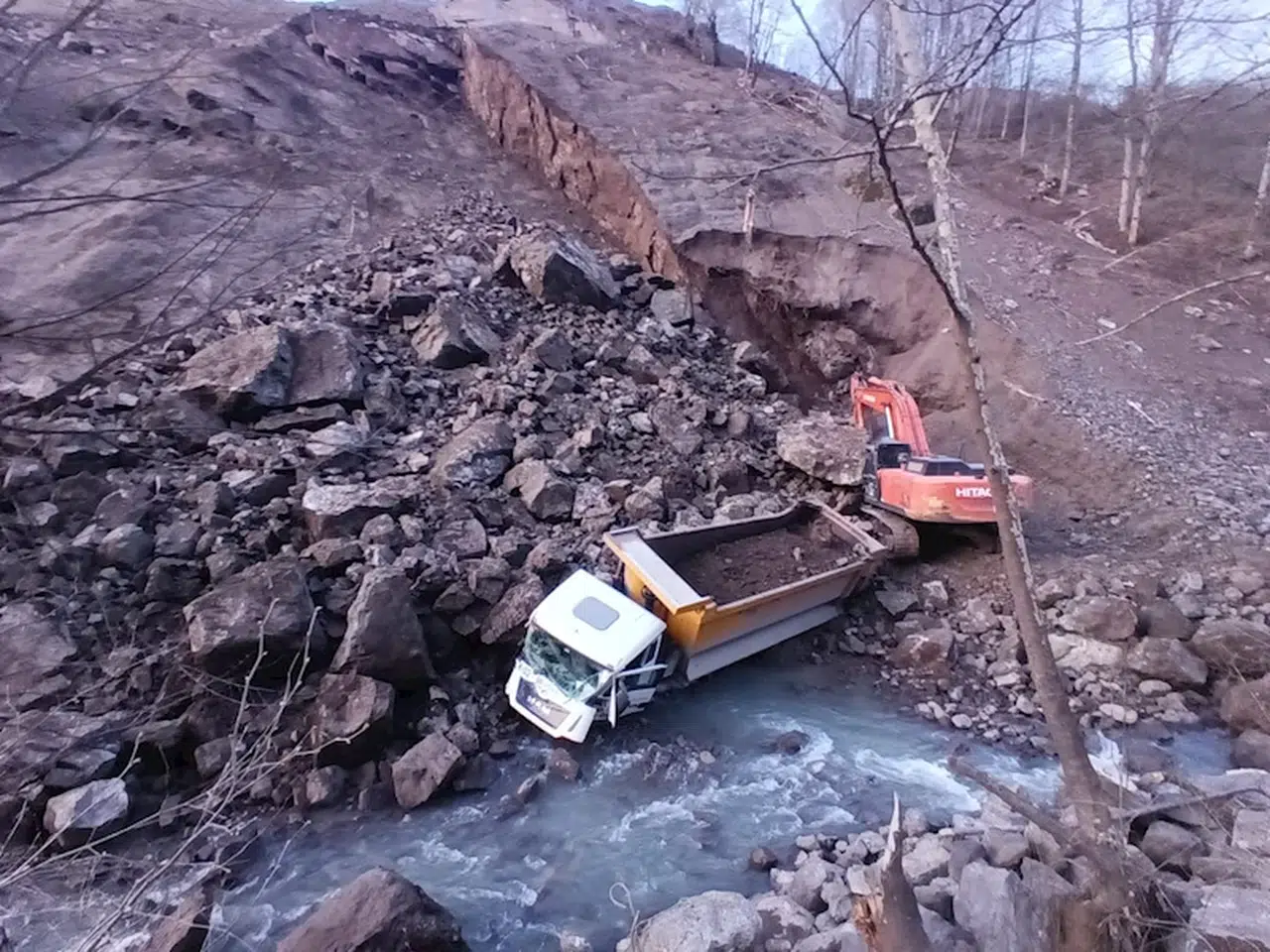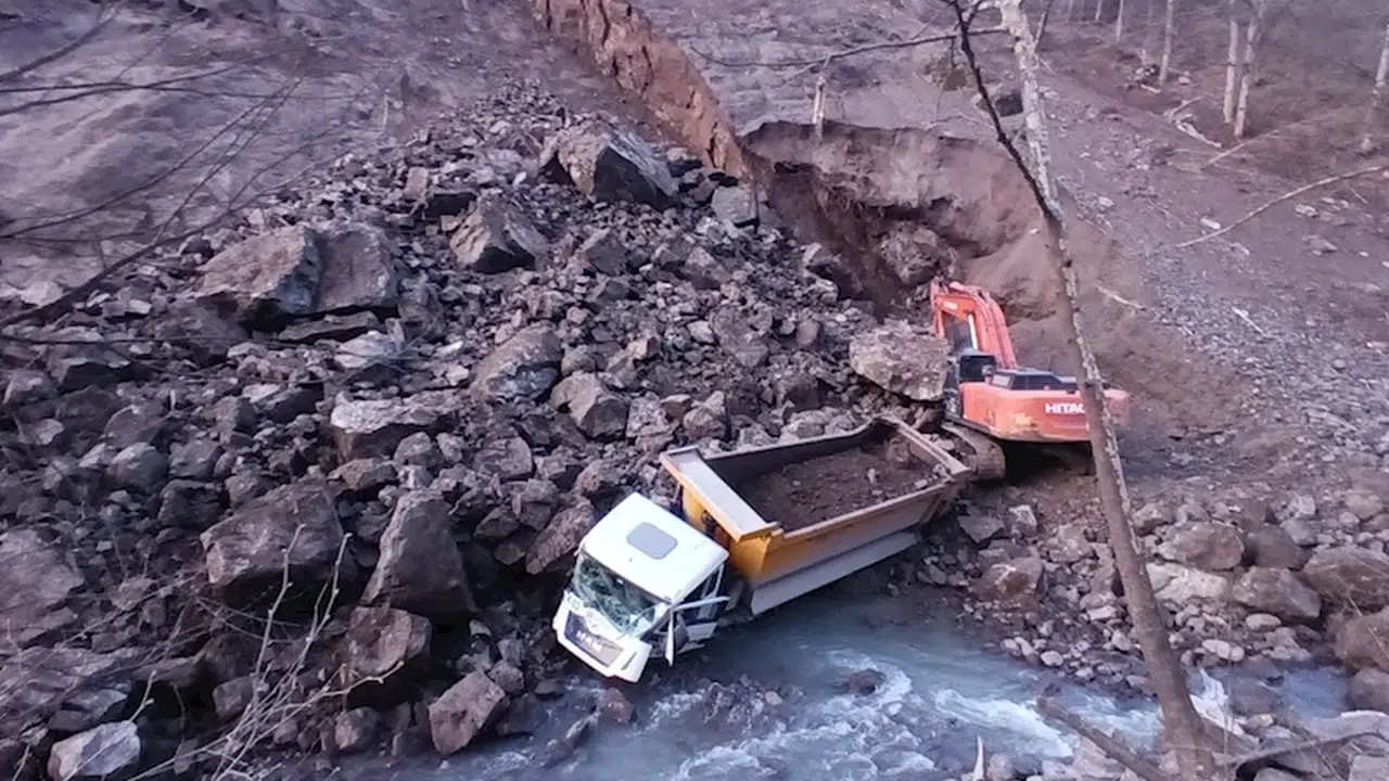 Kamyon ve iş makinesi heyelan altında kaldı; 1 yaralı