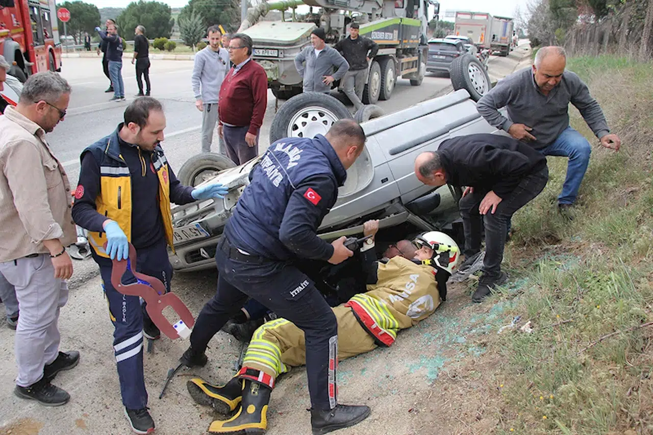 Kamyona çarpmamak için sürücüsünün manevra yaptığı otomobil takla attı: 2 yaralı