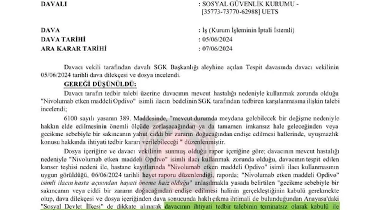 “Dosya içeriğine ve davacı vekilinin sunmuş olduğu rapor içeriğine göre; davacının mevcut hastalığı nedeniyle ‘nivolumab etken maddeli Opdivo’ isimli ilacı kullanmak zorunda olduğu, davacının tespit edilen kanser teşhisi nedeni ile hastane kayıtlarında ‘nivolumab etken maddeli Opdivo’ isimli ilacı kullanmasının uygun görüldüğü, 6 Haziran 2024 tarihli heyet raporu düzenlendiği, raporda; ilacın hasta açısından hayati öneme haiz olduğu anlaşılmakla yasada belirtilen gecikme sebebiyle bir sakıncanın veya ciddi bir zararın doğacağından endişe edilmesi halinin gerçekleştiğinin kabulü gerekmekte olup, dava dilekçesi ve dosya içeriğinde dava sonucunda haklı çıkma ihtimali de bulunduğundan Anayasa’daki ‘Sosyal Devlet İlkesi’ de dikkate alınarak davacının ihtiyati tedbir talebinin teminatsız olarak kabulü ile davacının tedavisinde kullanılması önerilen ‘nivolumab etken maddeli Opdivo’ isimli ilacın ücretinin 6 Haziran 2024 ile 6 Aralık 2024 tarihleri arasında tedbiren SGK tarafından kesintisiz tam ve eksiksiz olarak karşılanmasına karar vermek gerekmiştir.”