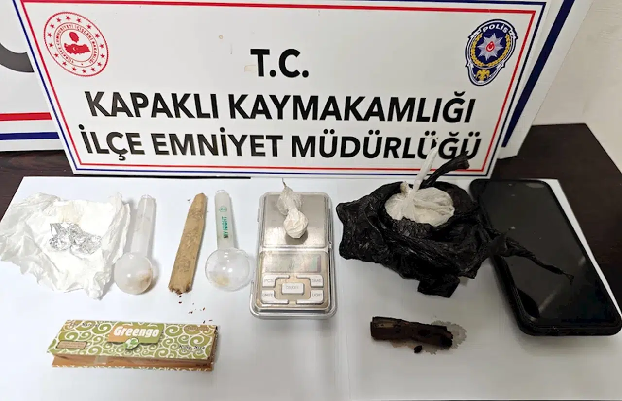 Kapaklı İlçe Emniyet Müdürlüğü ekipleri, uyuşturucu madde satışı yaptığını belirlediği E.B.'yi takibe aldı. E.B.'nin durdurulup üzerinde yapılan aramada, 31 gram metamfetamin,1.2 gram kokain, 2 uyuşturucu madde kullanma aparatı, 4.90 gram esrar, esrar sarma kağıdı ve hassas terazi ele geçirildi. Gözaltına alınana E.B., sevk edildiği adliyede çıkarıldığı mahkemede tutuklandı. (DHA)