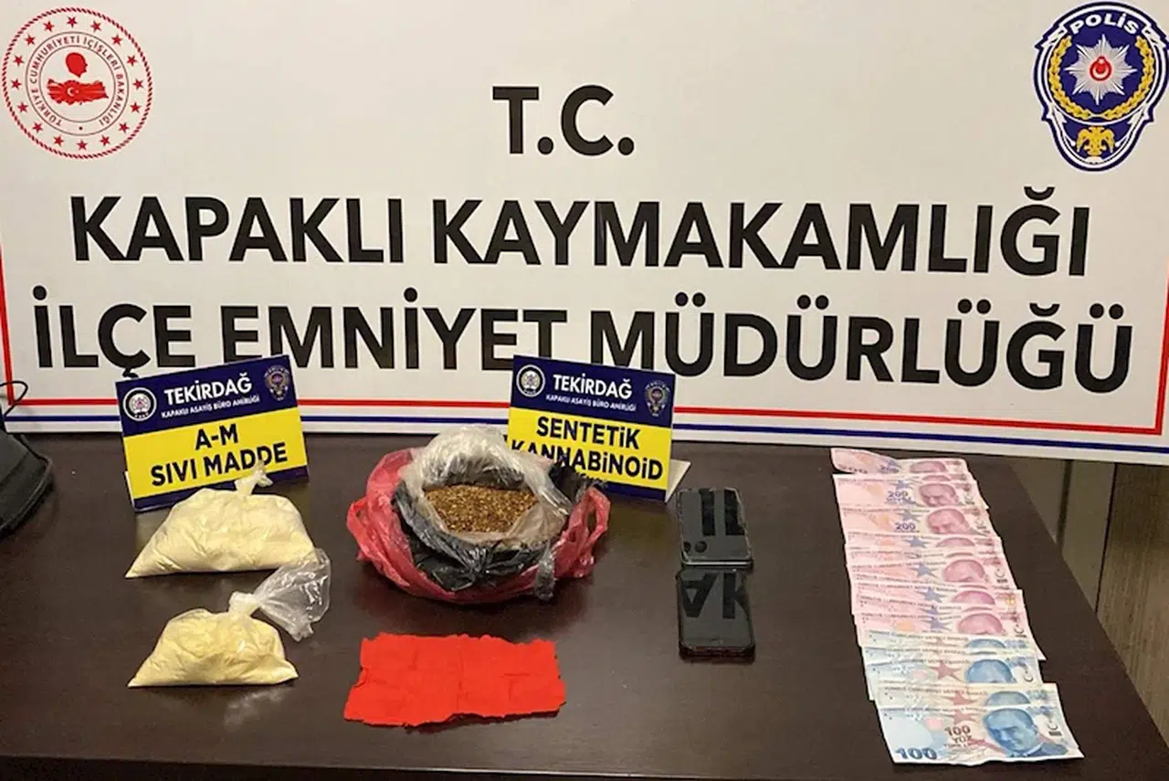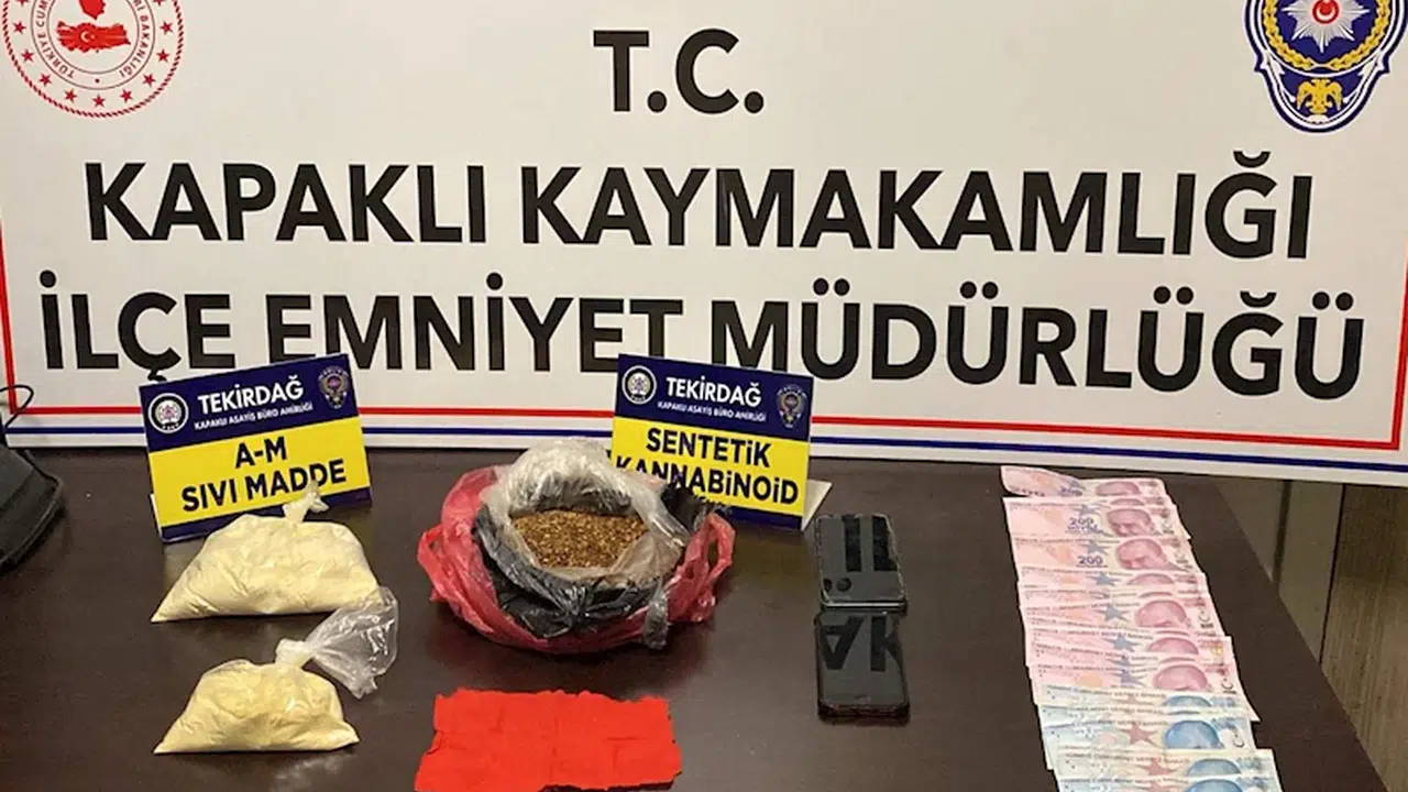 Kapaklı İlçe Emniyet Müdürlüğü ekipleri, uyuşturucu veya uyarıcı madde imal ve ticaretine yönelik çalışmasında, M.C.A ve C.G.'yı takibe aldı. Takibin ardından gözaltına alınan 2 şüphelinin üzeri ve evlerinde yapılan aramada, 265 gram sentetik kannabinoid, 551 gram uyuşturucu hammaddesi, uyuşturucu madde emdirilmiş peçete, uyuşturucu ticaretinden elde edildiği değerlendirilen bir miktar para, iki cep telefonu ele geçirildi. Şüphelilerden C.G.'nin hırsızlık suçundan aranması bulunduğu belirlendi. Emniyetteki işlemlerinin ardından adliyeye sevk edilen 2 şüpheli çıkarıldıkları mahkemede tutuklandı. (DHA)