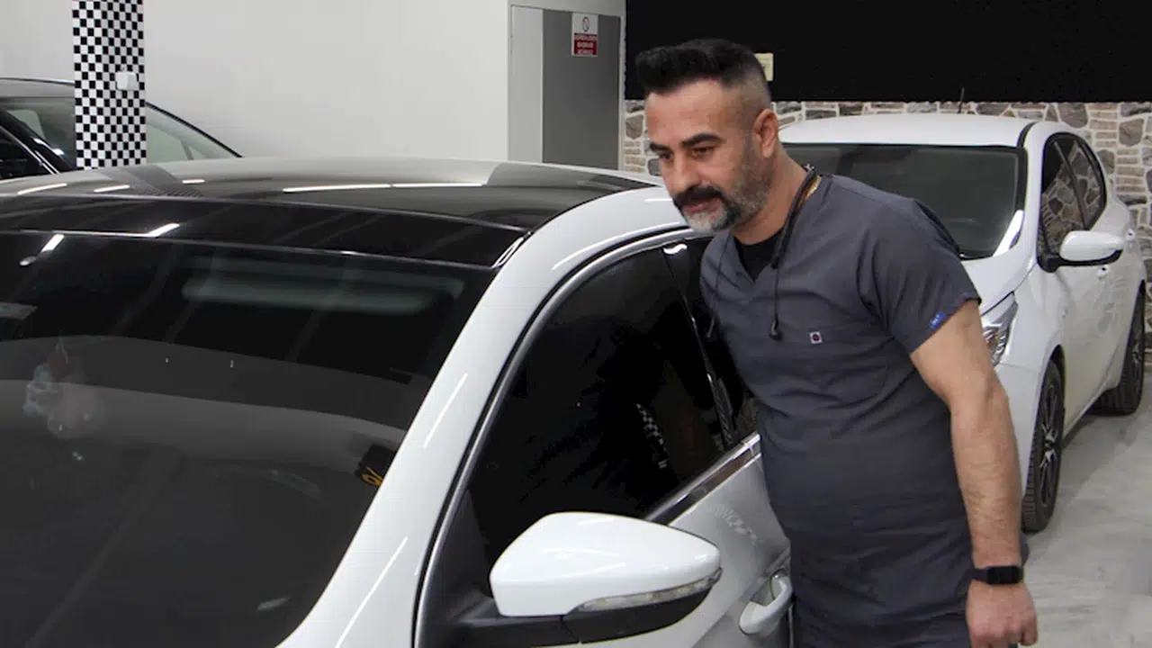 Kaporta ustası, araçları doktor kıyafeti giyerek tamir ediyor