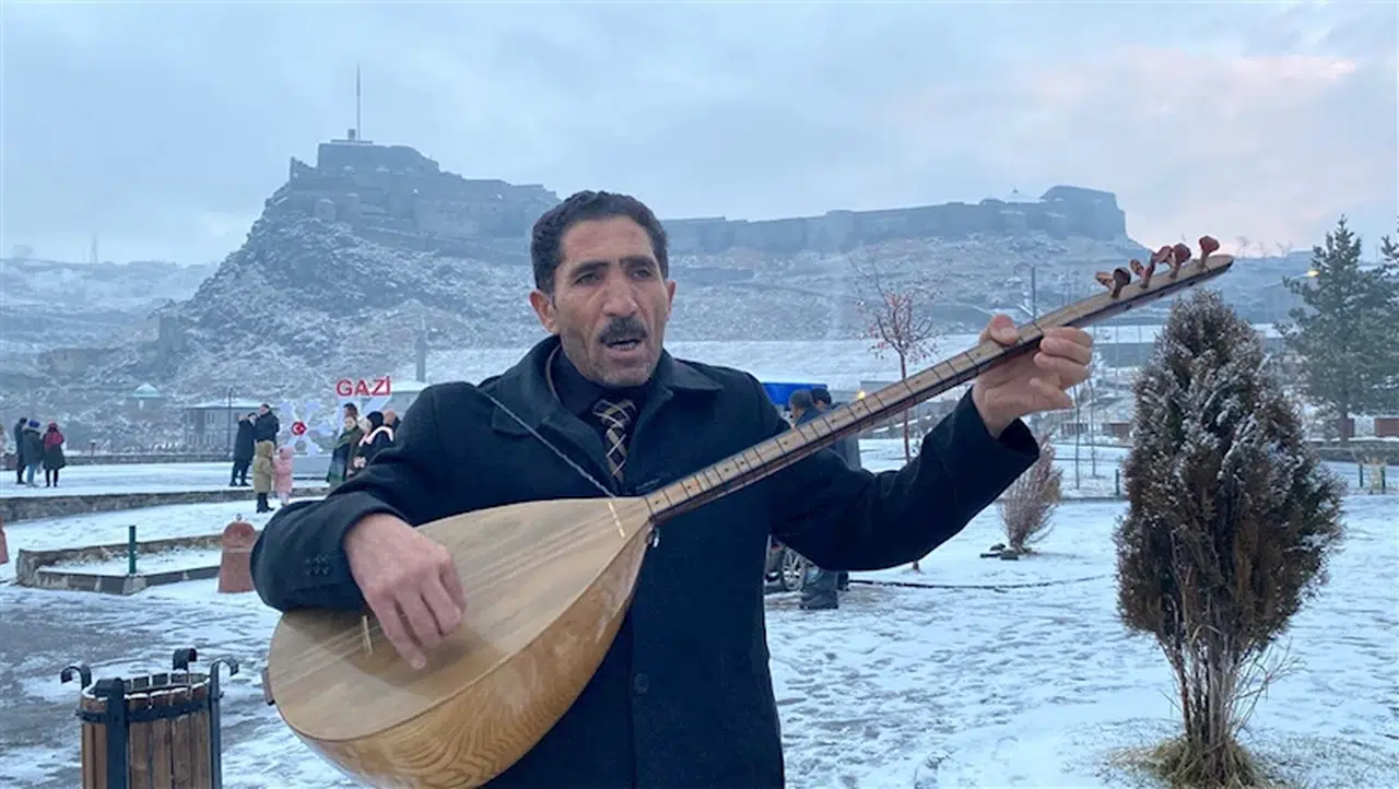 Yüksel Öztürk, yerli ve yabancı turistlerin yoğun olarak ziyaret ettiği Kars Kalesi'ne geldi. Burada kuraklığa dikkat çeken Öztürk, kar sevincini, sazının teline vurup, şu sözlerle dile getirdi: