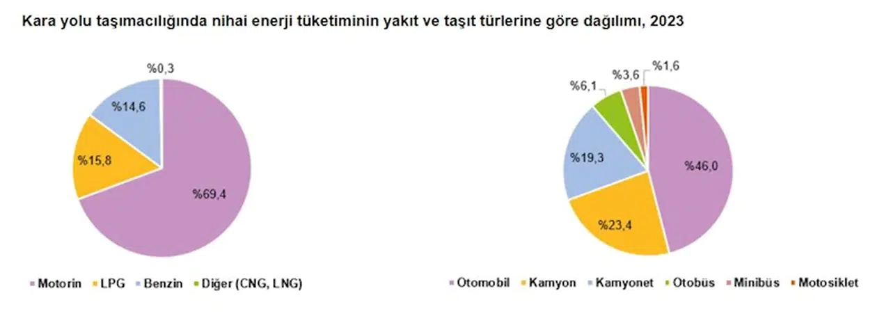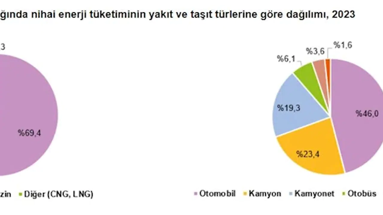 Kara yolu taşımacılığında 2023 yılında tüketilen nihai enerjinin, yüzde 46'sını otomobiller, yüzde 23,4'ünü kamyonlar, yüzde 19,3'ünü kamyonetler ve yüzde 6,1'ini otobüsler tüketti. Demir yolu taşımacılığında 2023 yılında nihai enerji tüketimi 9 bin 905 terajul oldu. Enerji tüketiminde motorinin payı 49 olurken, elektriğin payı yüzde 51 olarak gerçekleşti. Demir yolu taşımacılığında 2023 yılında motorin tüketimi bir önceki yıla göre yüzde 7,4 azalırken, elektrik tüketimi ise yüzde 3 oranında artış gösterdi. Yüksek hızlı trenlerin elektrik tüketimi yüzde 20, tramvay ve metroların elektrik tüketimi ise yüzde 7,5 arttı. (DHA)