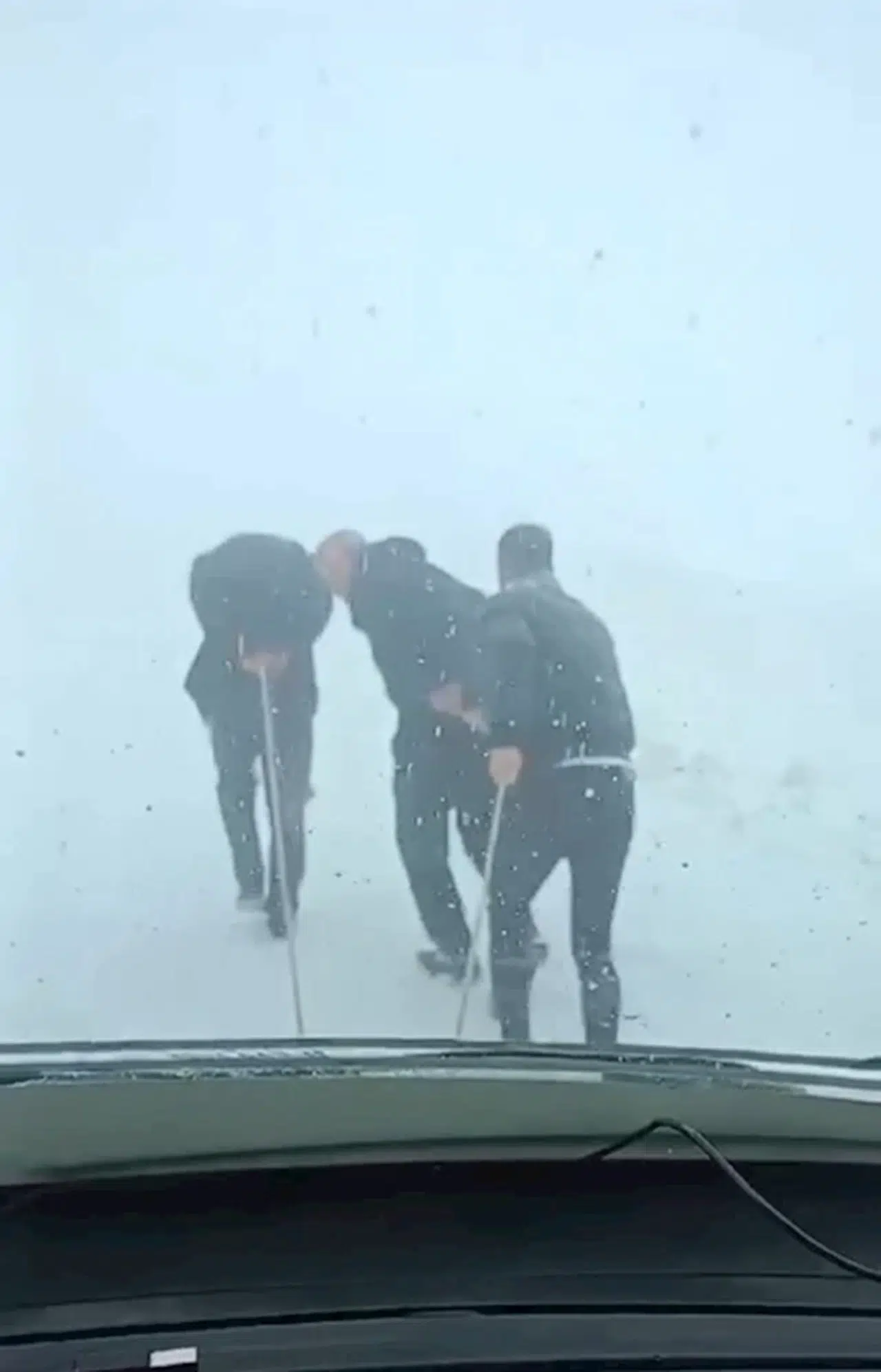 Behçet DALMAZ/VAN, (DHA)- VAN-Bahçesaray kara yolu üzerindeki 3 bin rakımlı Karabet Geçidi'nde kar yağışı etkili oldu. Yolda kalan bir minibüsü yolcular halat bağlayarak çekti.
