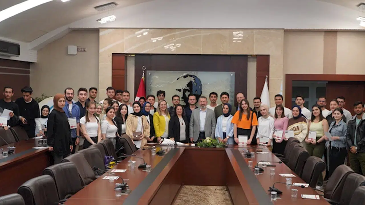 Akademisyen ve öğrencilerle sohbet eden Kırışık, misafirlerine tebrik kartı ve ağaç tohumu hediye etti.
