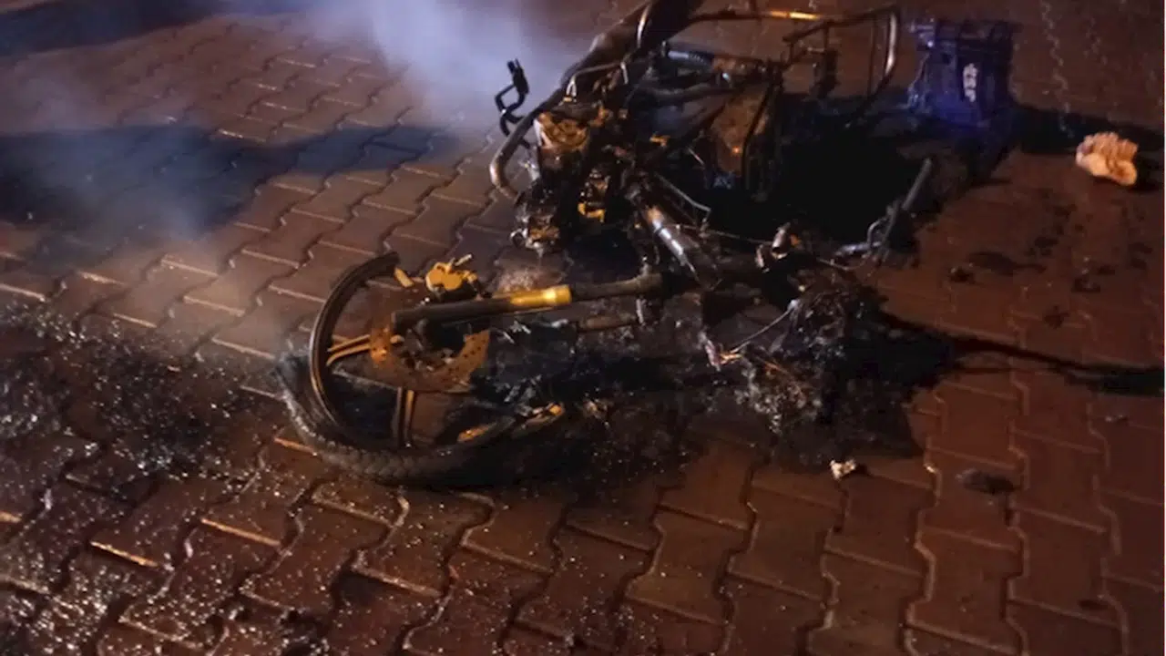 İtfaiye erlerinin müdahalesiyle söndürülen yangında motosiklet kullanılamaz hale geldi.