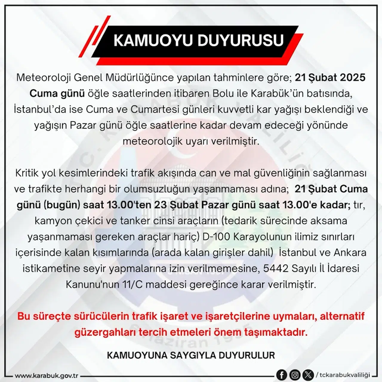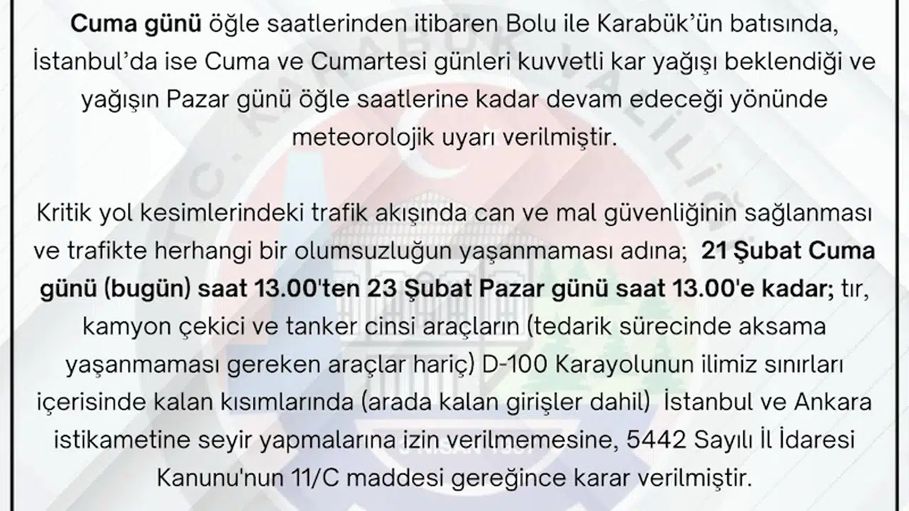 Karabük Valiliği, kar yağışı nedeniyle ağır taşıtların geçişinin kısıtlandığını duyurdu. Valilikten yapılan açıklamada, "Meteoroloji Genel Müdürlüğünce yapılan tahminlere göre; 21 Şubat 2025 Cuma günü öğle saatlerinden itibaren Bolu ile Karabük'ün batısında, İstanbul'da ise cuma ve cumartesi günleri kuvvetli kar yağışı beklendiği ve yağışın pazar günü öğle saatlerine kadar devam edeceği yönünde meteorolojik uyarı verilmiştir. Kritik yol kesimlerindeki trafik akışında can ve mal güvenliğinin sağlanması ve trafikte herhangi bir olumsuzluğun yaşanmaması adına 21 Şubat Cuma günü saat 13.00'ten 23 Şubat Pazar günü saat 13.00’e kadar, TIR, kamyon, çekici ve tanker cinsi araçların (tedarik sürecinde aksama yaşanmaması gereken araçlar hariç) D-100 Karayolunun ilimiz sınırları içerisinde kalan kısımlarında (arada kalan girişler dahil) İstanbul ve Ankara istikametine seyir yapmalarına izin verilmemesine, 5442 Sayılı İl İdaresi Kanunu’nun 11/C maddesi gereğince karar verilmiştir. Bu süreçte sürücülerin trafik işaret ve işaretçilerine uymaları, alternatif güzergahları tercih etmeleri önem taşımaktadır" denildi. (DHA)