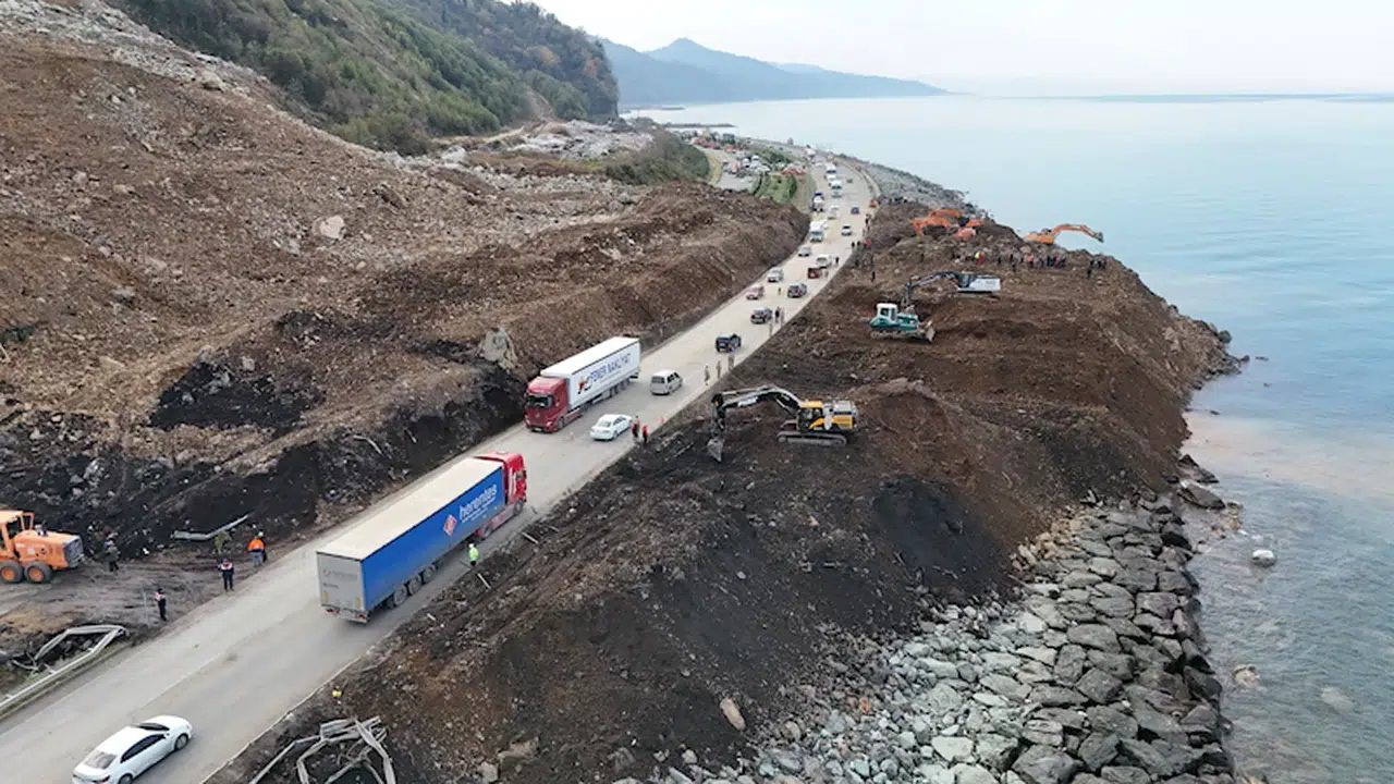 Karadeniz Sahil Yolu'nda ekipler, yol açma, temizlik ve yol onarım çalışmalarını sürdürüyor. Akıntının devam ettiği yamaçtan kopan toprak ve kayaların ulaşıma kapanan yolda ekipler, iş makineleri ile hafriyat kaldırma işlemlerine devam ediyor. Gece geç saatlere kadar süren çalışmalar sabahın ilk ışıklarında yeniden başladı. Heyelanın izlerinin silinmeye çalışıldığı bölgede ulaşım tek yönden sağlanmaya devam ediyor. (DHA)