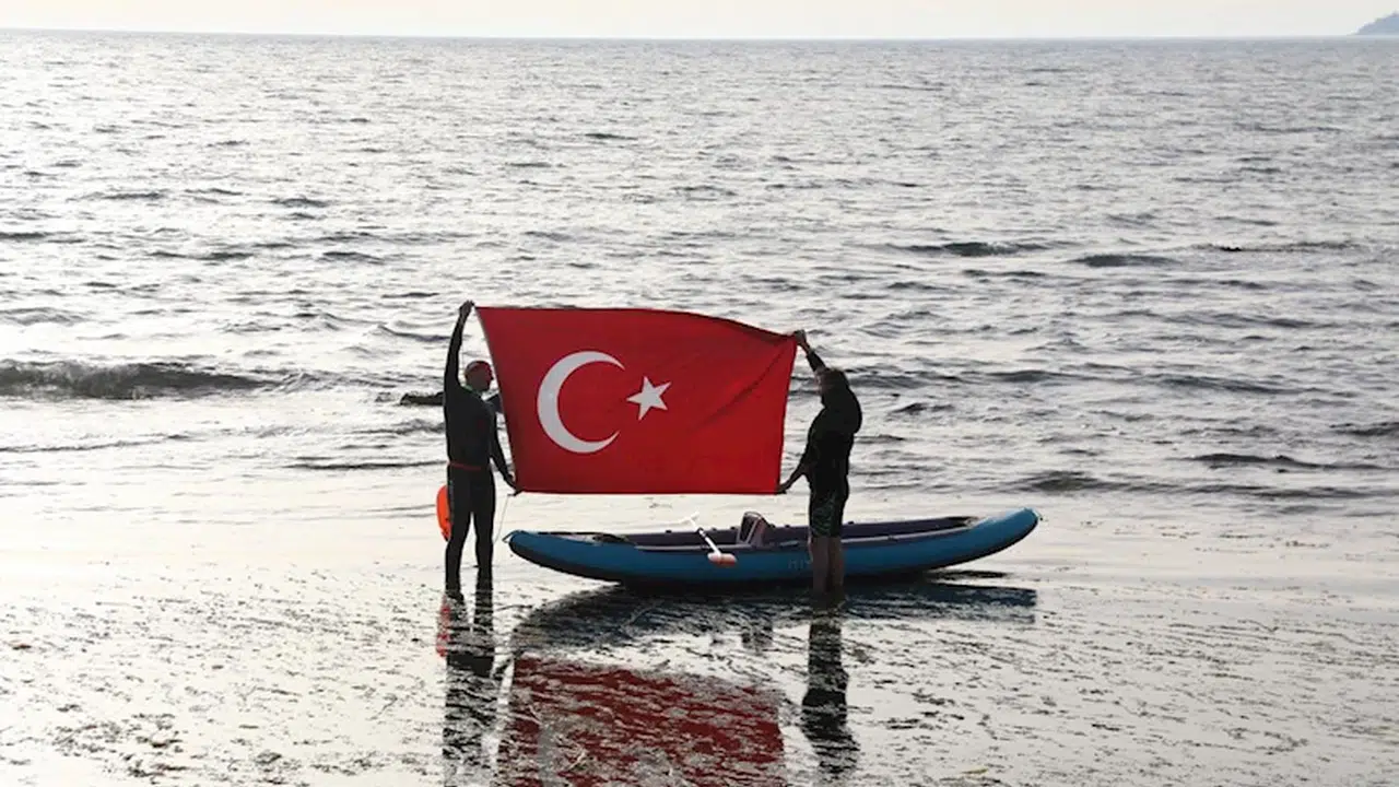 Emrah GEMİCİOĞLU/ORDU, (DHA)- ORDU’da, Karadeniz Su Sporları Kulübü sporcularından Cem Eroğlu, ‘19 Mayıs Atatürk’ü Anma, Gençlik ve Spor Bayramı’ dolayısıyla Yason Burnu ile Hoynat Adası arasında kulaç attı.