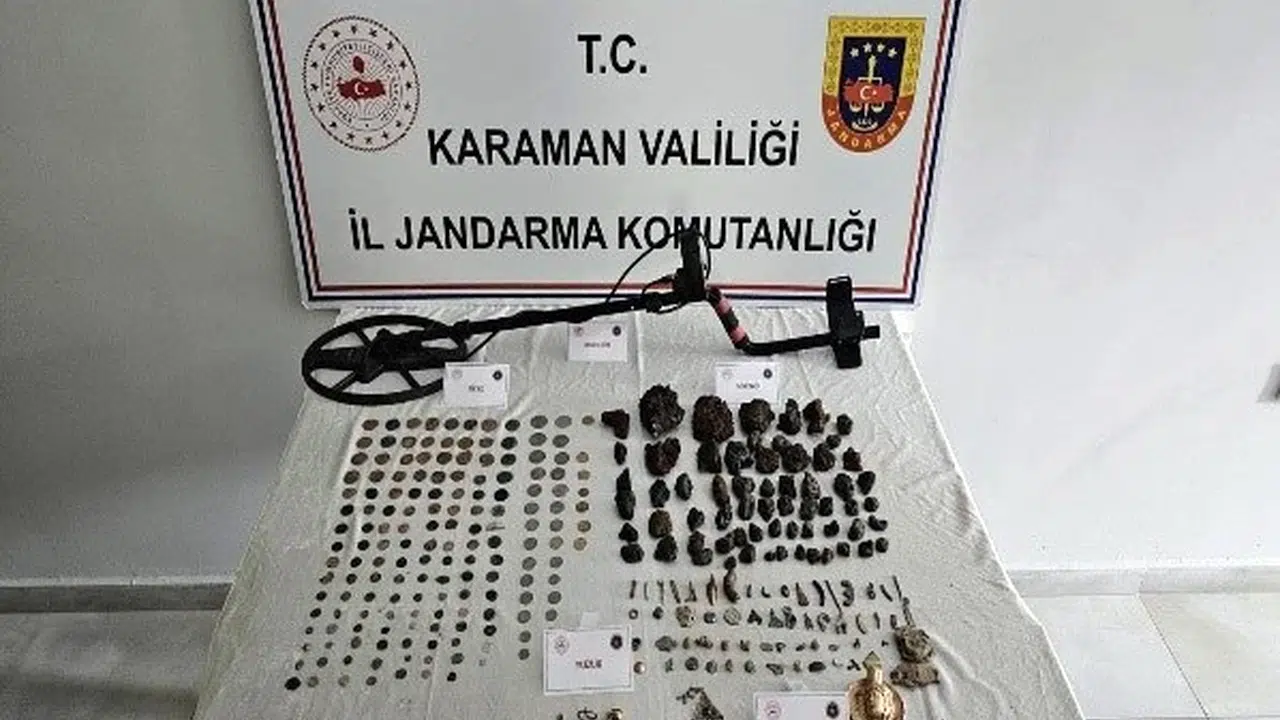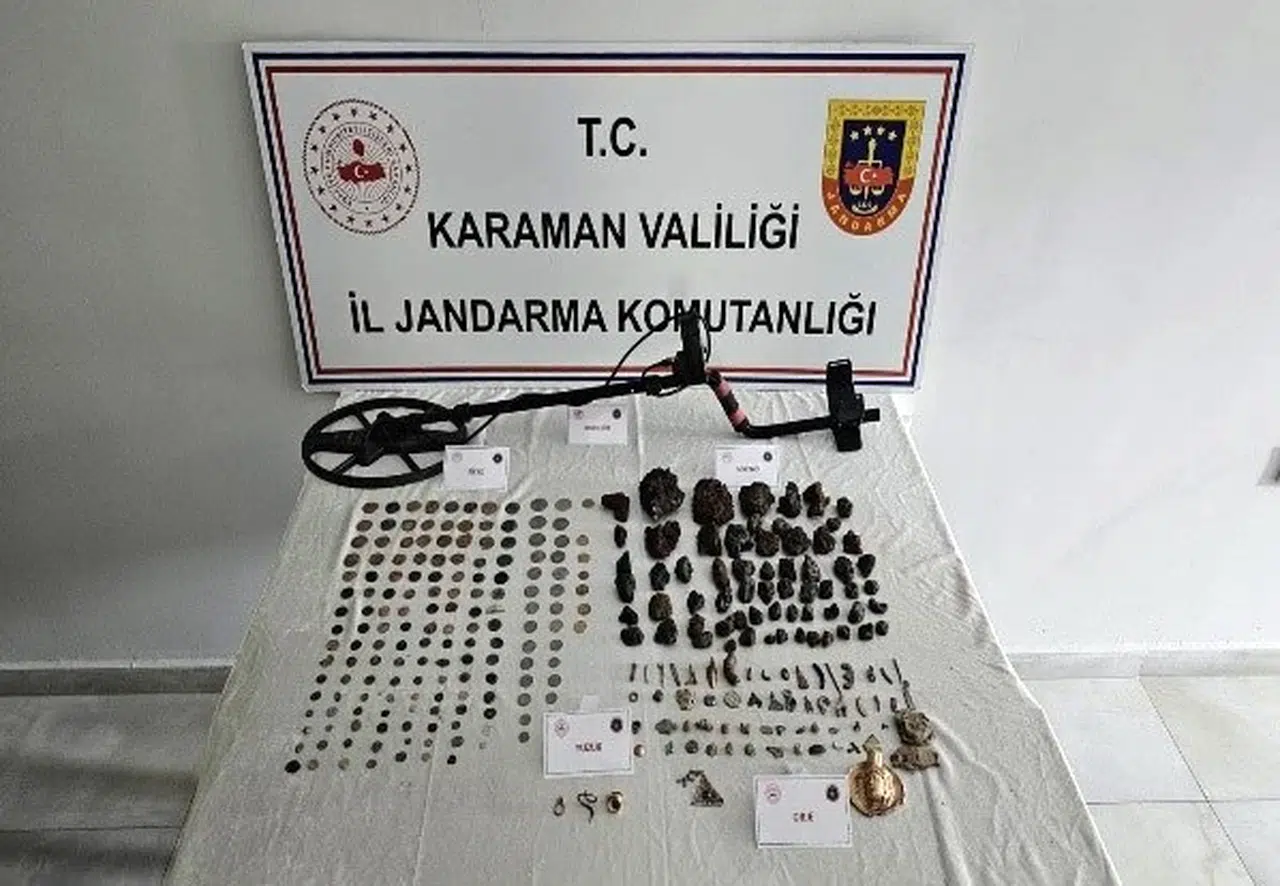 Muammer ŞEN/KARAMAN, (DHA)-KARAMAN'da jandarma ekiplerince yapılan uygulamada 118 adet göktaşı, 203 adet sikke, 50 adet farklı boyutlarda ve ebatlarda tarihi obje, 163 adet bakır ve gümüşü renkli sikke, 12 adet yüzük ve kolye parçası ele geçirildi.