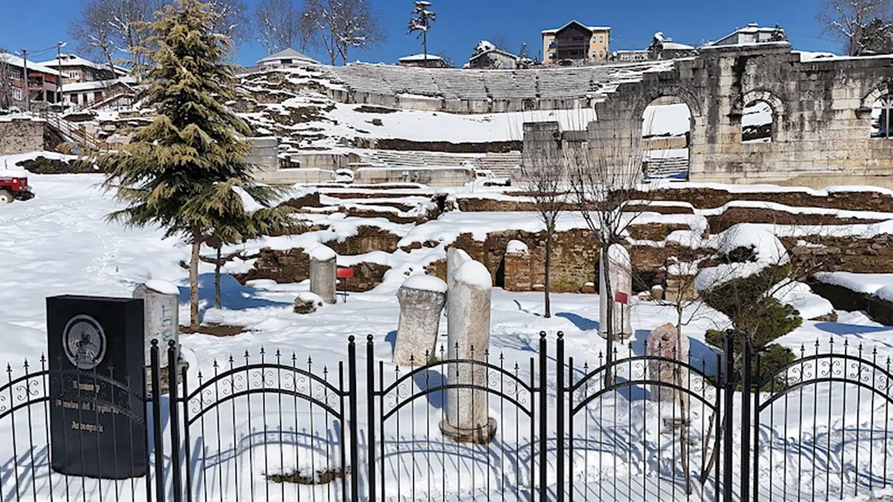 Karla kaplı antik tiyatro dron ile görüntülendi