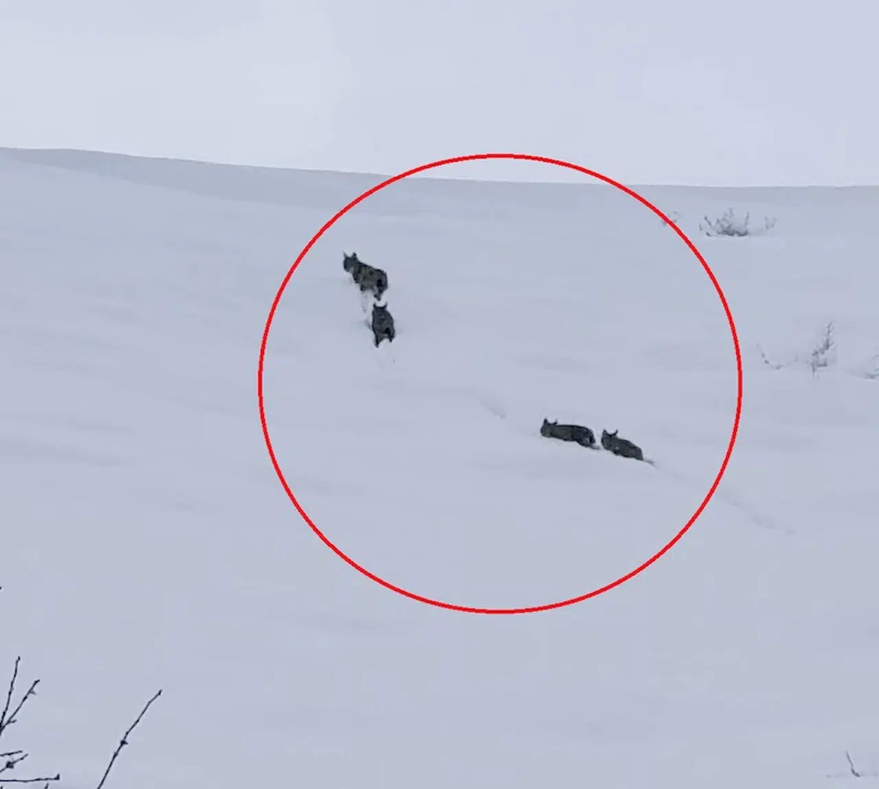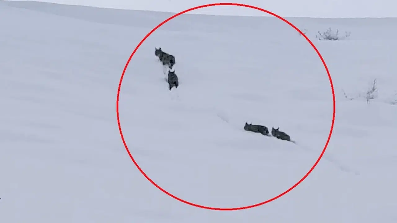 Karla kaplı arazide vaşak ile 3 yavrusu görüntülendi