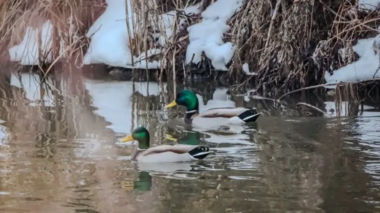 Kar ve soğuk hava nedeniyle yiyecek bulmakta zorluk çeken yeşilbaş ördekler, Kars Çayı'nda yiyecek ararken görüntülendi.
