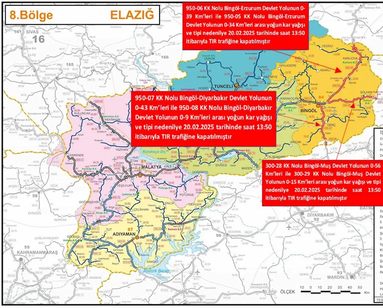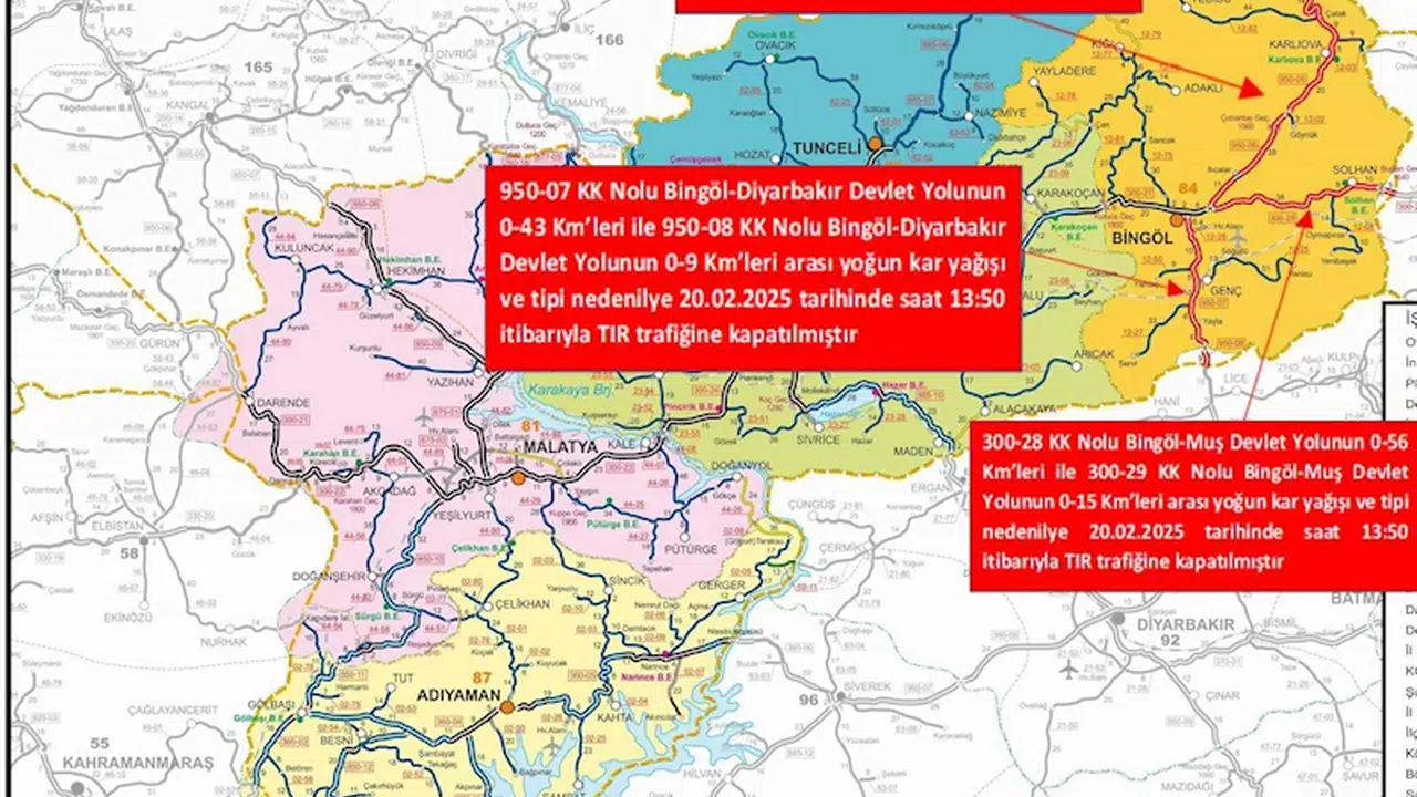 Bingöl'de kar yağışı ve tipi nedeniyle Bingöl-Erzurum, Bingöl-Diyarbakır ve Bingöl-Muş kara yolları, TIR trafiğine kapatıldı. Valilik açıklamasında, "950-06 KK nolu Bingöl-Erzurum kara yolunun 0-39 kilometreleri ile 950-05 KK nolu karayolu 0-39 kilometreleri, 950-07 KK nolu Bingöl-Diyarbakır kara yolunun 0-9, 950-08 nolu Bingöl Diyarbakır karayolunun 0-43 kilometreleri ile 300-28 KK nolu Bingöl-Muş kara yolunun 0-56 kilometreleri ve 300-29 KK nolu Bingöl-Muş kara yolunun 0-15 kilometreleri arası yoğun kar yağışı ve tipi nedeniyle 20 Şubat 2025 tarihinde saat 13.50 itibariyle TIR trafiğine kapatılmıştır" denildi.(DHA)