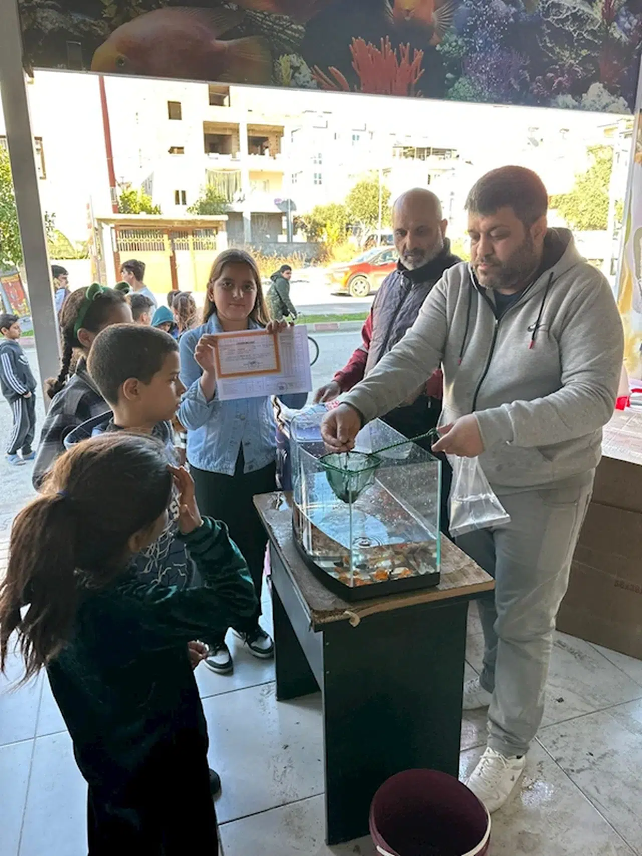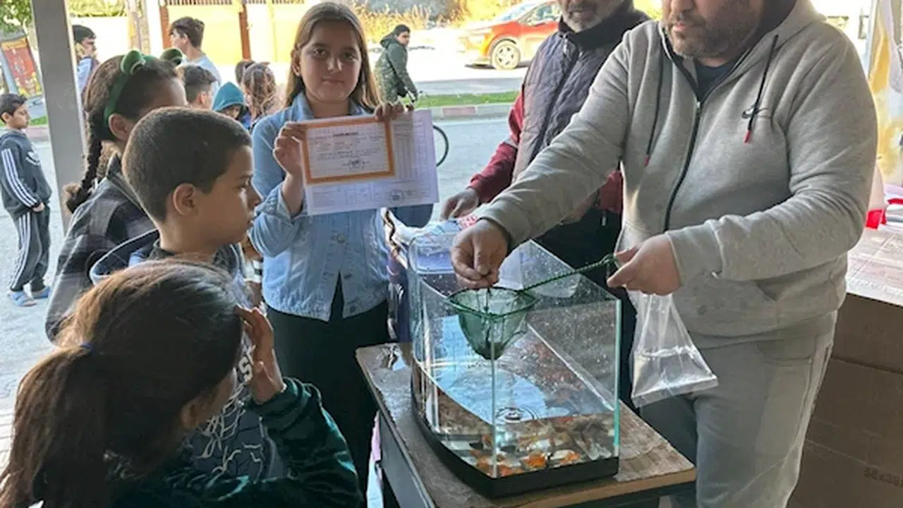 Ceyhun ÖZER/CEYHAN(Adana)(DHA)-Adana’nın Ceyhan ilçesinde bir esnaf, çocuklara hayvan sevgisi aşılamak için karnesini getiren öğrencilere akvaryum balığı hediye etti.