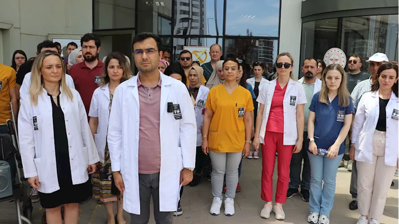 Kastamonu Eğitim ve Araştırma Hastanesi önünde bir araya gelen doktorlar, 11 Haziran'da Sinop'ta meydana gelen trafik kazasında yaşamını yitiren doktorlar Sena Sakin ve Mehmet Turan Yazlak için saygı duruşunda bulundu.