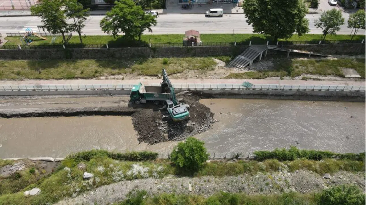 Kamyonlarla dere içinden çıkartılan malzemeler, belirlenen alanlara boşaltılıyor.