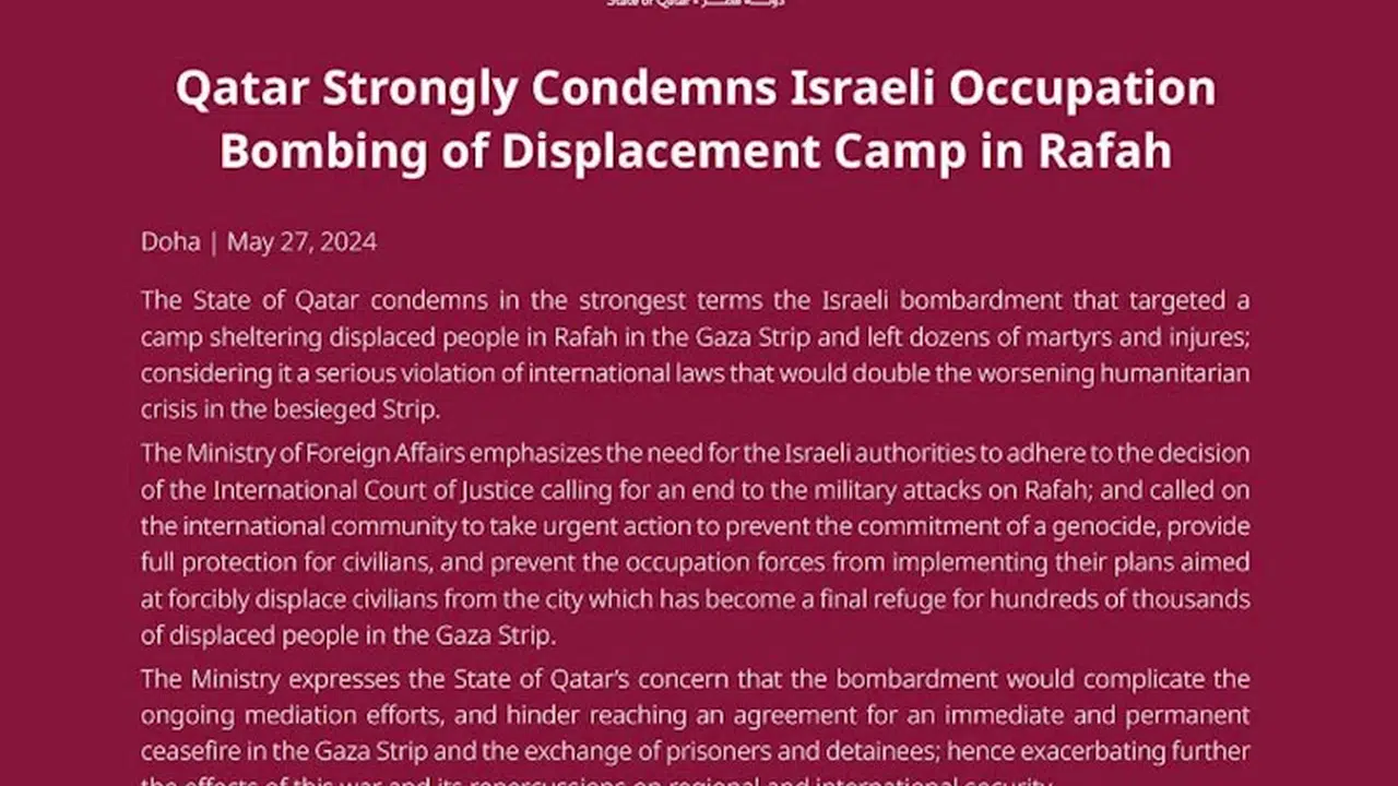 Katar Dışişleri Bakanlığı’ndan yapılan açıklamada, “Katar, Gazze Şeridi'ndeki Refah'ta yerlerinden edilmiş insanların barındığı bir kampı hedef alan İsrail bombardımanını en güçlü ifadelerle kınamaktadır. Dışişleri Bakanlığı, bombardımanın devam etmekte olan arabuluculuk çabalarını zorlaştıracağı, acil ve kalıcı bir ateşkes için anlaşmaya varılmasını engelleyeceği konusunda Katar'ın endişelerini ifade etmektedir” denildi.