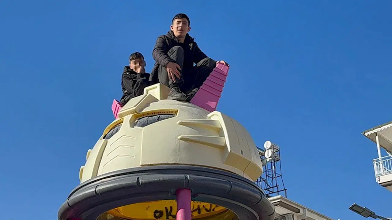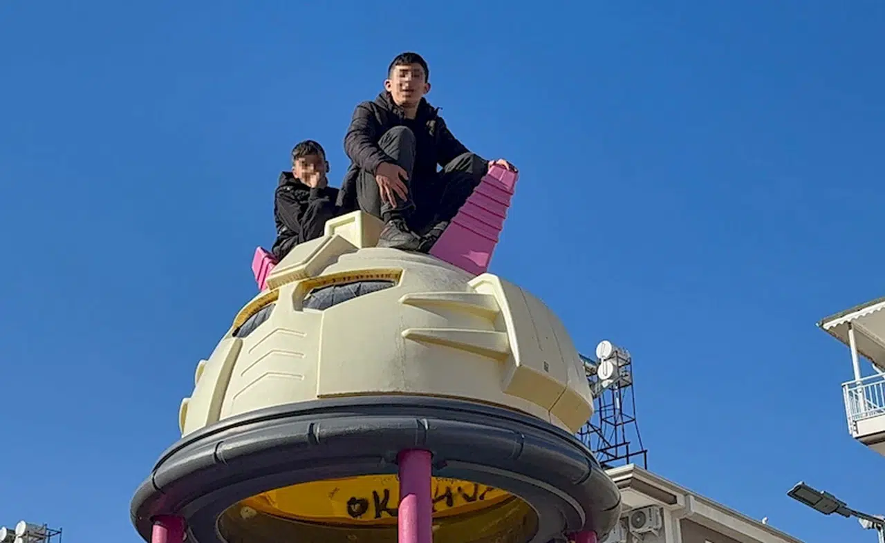 Aşağıya güvenli şekilde indirilen çocuklardan Efe D., "Burada körebe oyunu oynuyorduk. Ebelenmemek için ve birbirimizin gazına gelerek kaydırağın üzerine çıktık ve orada kaldık. İtfaiye de gelip bizi indirdi" dedi. (DHA)