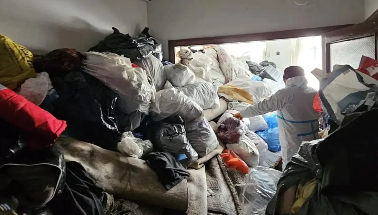 Ekipler tarafından evde istiflenmiş halde bulunan kıyafetler ve çeşitli atıklar ayrıştırılararak torbalandı. Saatler süren çalışmalar sonucunda evden toplam 4 kamyon dolusu çöp tahliye edildi.