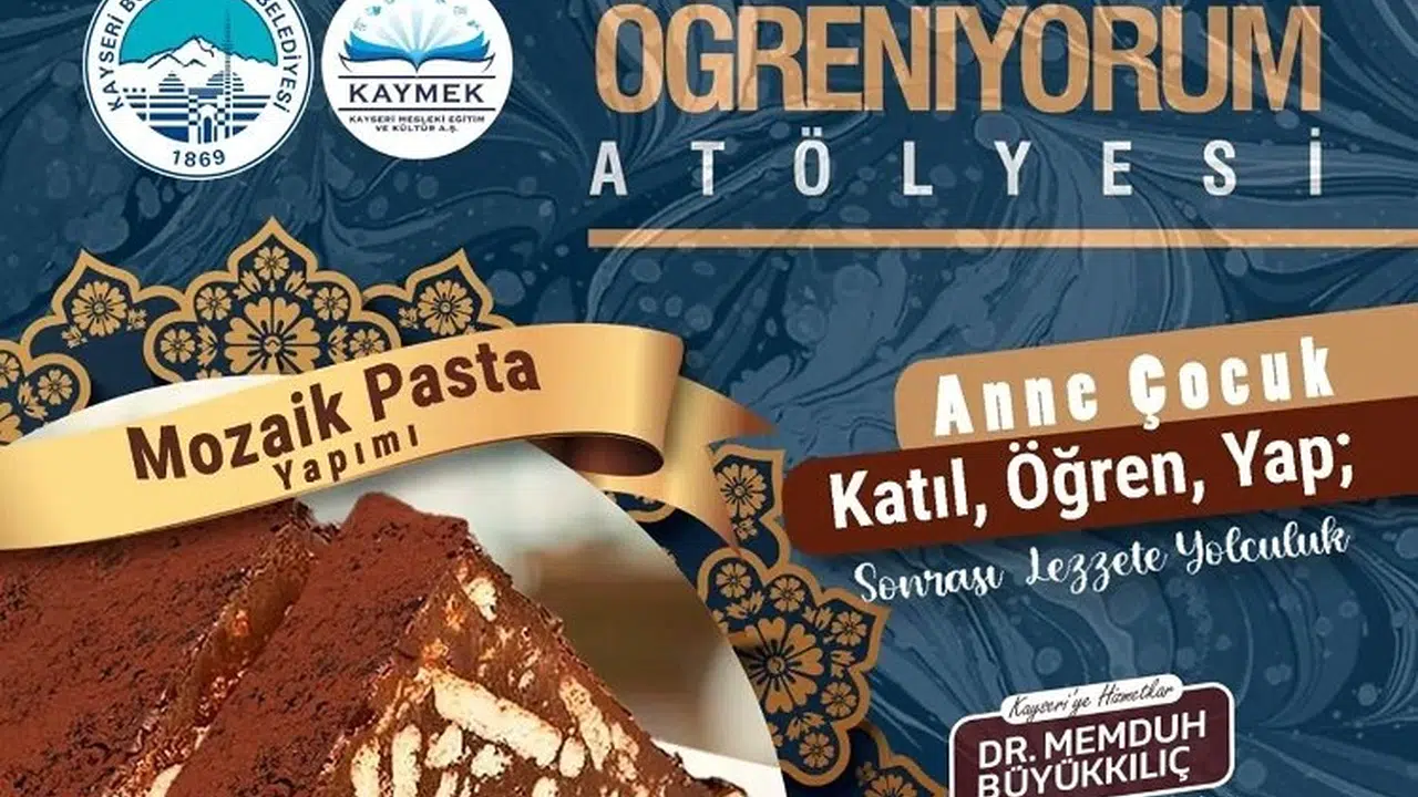 Kayseri Büyükşehir Belediyesi’nin eğitim alanında amiral gemisi olan Kayseri Mesleki Eğitim ve Kültür A.Ş. “KAYMEK’le Öğreniyorum Atölyesi” kapsamında aile içi bağları kuvvetlendirmek ve mutfak sanatları becerilerini çocukları ile birlikte geliştirmek amacıyla Anne-Çocuk Mozaik Pasta Yapımı Etkinliği düzenliyor.