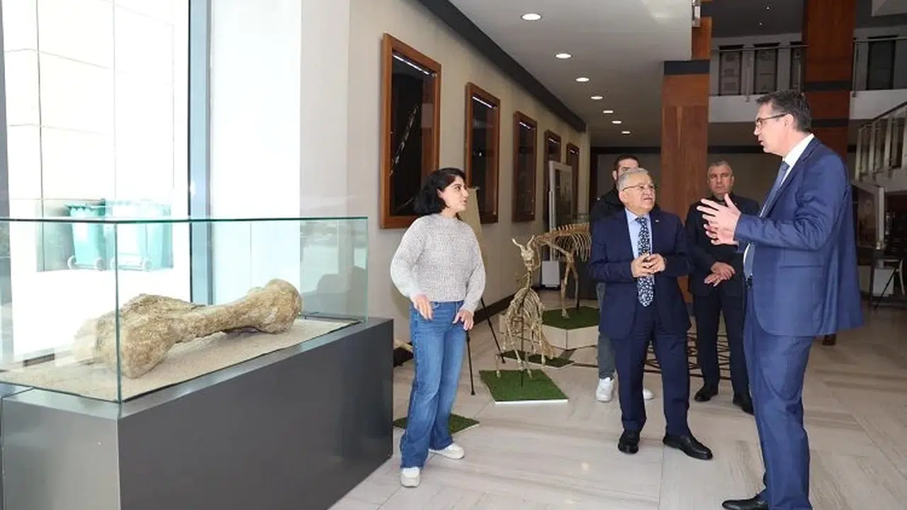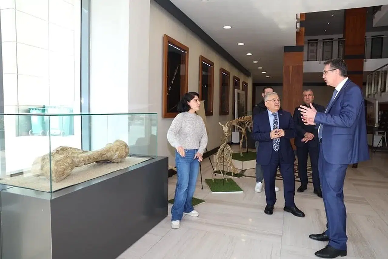 Başkan Büyükkılıç, Başsavcı Bölükbaşı’ya, Büyükşehir Belediyesi Başkanlık girişinde, dünya jeoloji tarihine ışık tutan 7,5 milyon yıllık fosillerin ayaklandırma çalışmalarının yer aldığı sergiyi gezdirdi.