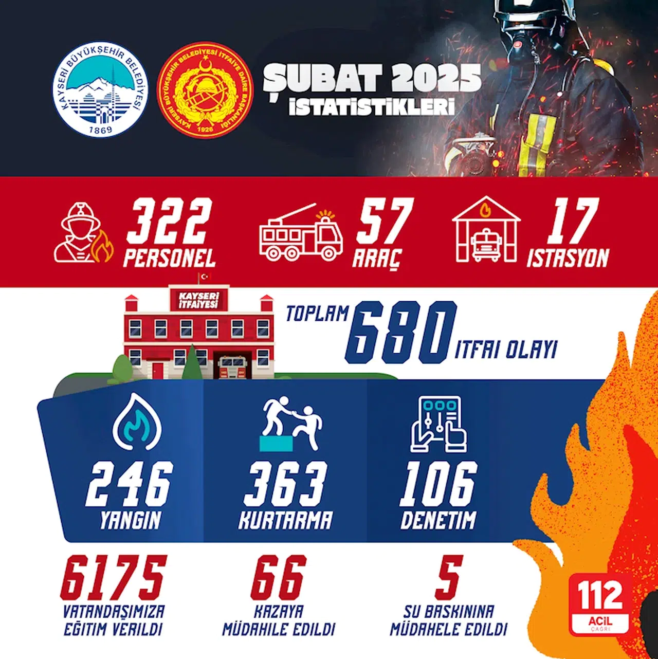KAYSERİ, (DHA)- KAYSERİ Büyükşehir Belediyesi İtfaiye Daire Başkanlığı ekipleri, şubat ayında 680 olaya müdahale ederek, 6 bin 175 vatandaşa eğitim verdi ve 106 denetim gerçekleştirdi.