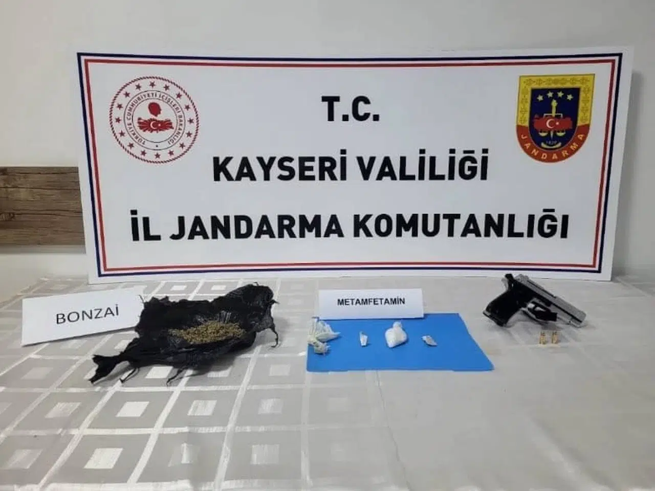 İl Jandarma Komutanlığı Kaçakçılık ve Organize Suçlarla Mücadele Şube Müdürlüğü ile İstihbarat Şube Müdürlüğü ekipleri, uyuşturucu ticareti yapan kişilerin yakalanmasına yönelik çalışmalarını sürdürüyor. Bu kapsamda Kocasinan ilçesi Şeker Mahallesinde bir otomobilde bulunan O.K., Ş.Ö. ve Ö.A.'nın uyuşturucu ticareti yaptıkları belirlendi. 3 şüpheli araç içinde suçüstü yakalandı. Araçta yapılan aramalarda 16 gram metamfetamin, 30 gram bonzai, 1 adet ruhsatsız tabanca ve 1 adet şarjör ele geçirildi. Gözaltına alınan 3 şüpheli, İlçe Jandarma Komutanlığı'na götürüldü. (DHA)
