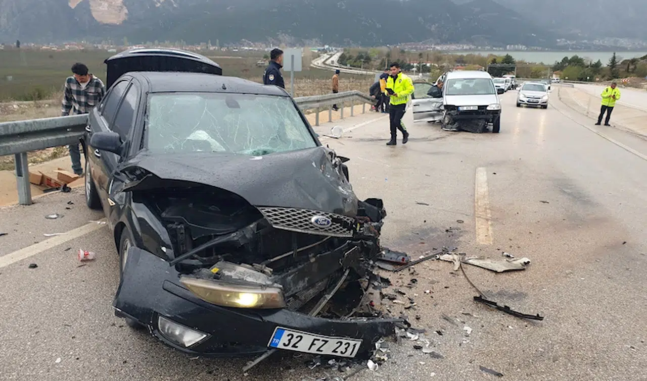 Kaza, dün akşam saatlerinde Eğirdir ilçesi Konya Yolu Konyabucağı Mezarlığı önünde meydana geldi. Konya'dan Eğirdir yönüne giden İsmet Atalay idaresindeki 32 ACG 204 plakalı otomobil, yağış nedeniyle kayganlaşan yolda kontrolden çıkıp karşı şeride geçerek Ercan Karakaya yönetimindeki 32 FZ 231 plakalı otomobille kafa kafaya çarptı. Kazada İsmet Atalay ile yanındaki Zeynep, Ali Hakan, İhsan ve Selda Atalay ve Ayşe Yılmaz ile diğer aracın sürücüsü Ercan Karakaya ve beraberindeki Faden Karakaya yaralandı.