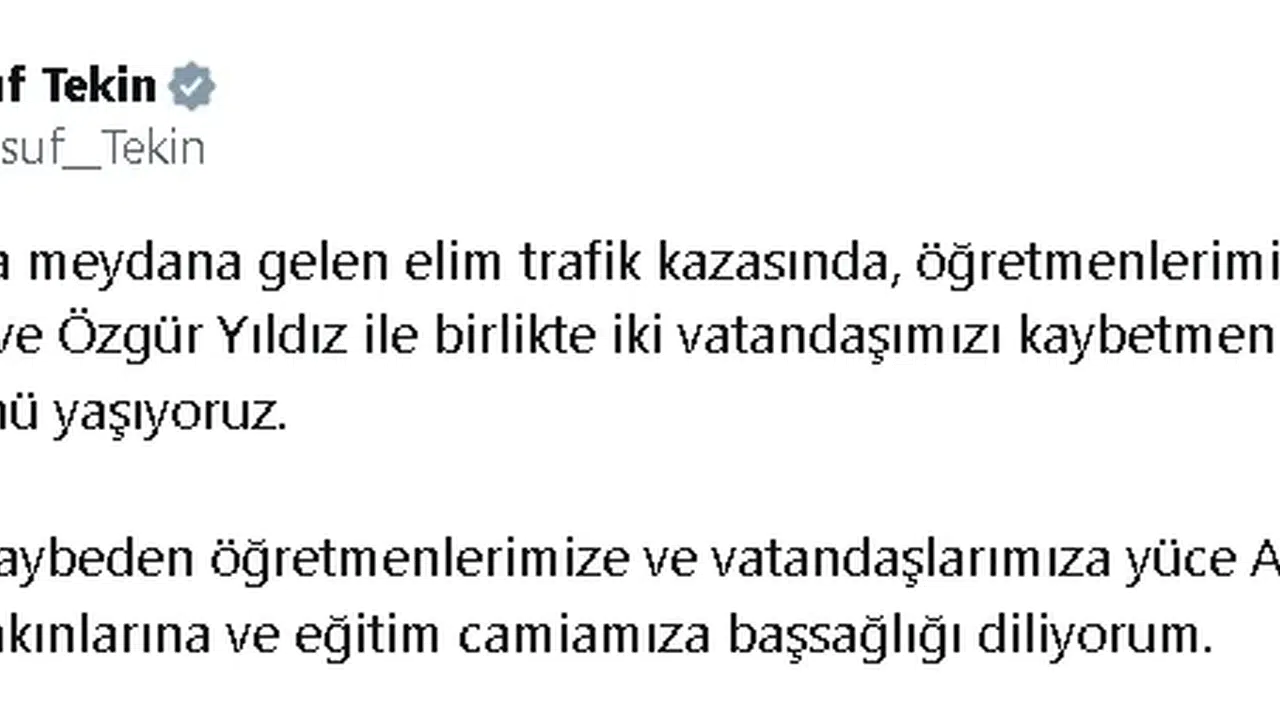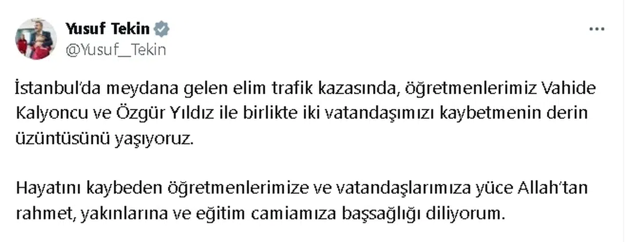 Milli Eğitim Bakanı Yusuf Tekin, sosyal medya hesabından yaptığı paylaşımda, "İstanbul’da meydana gelen elim trafik kazasında, öğretmenlerimiz Vahide Kalyoncu ve Özgür Yıldız ile birlikte iki vatandaşımızı kaybetmenin derin üzüntüsünü yaşıyoruz. Hayatını kaybeden öğretmenlerimize ve vatandaşlarımıza yüce Allah’tan rahmet, yakınlarına ve eğitim camiamıza başsağlığı diliyorum" ifadelerini kullandı. (DHA)